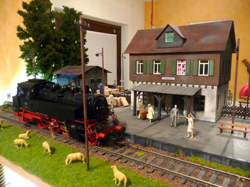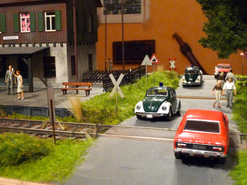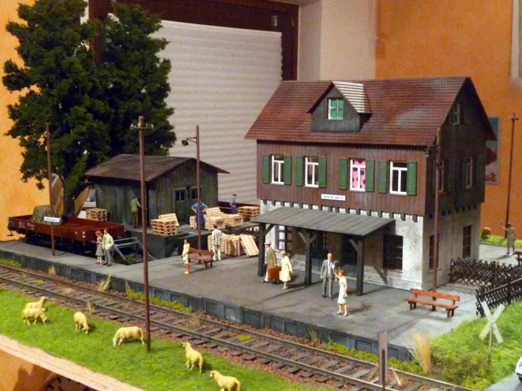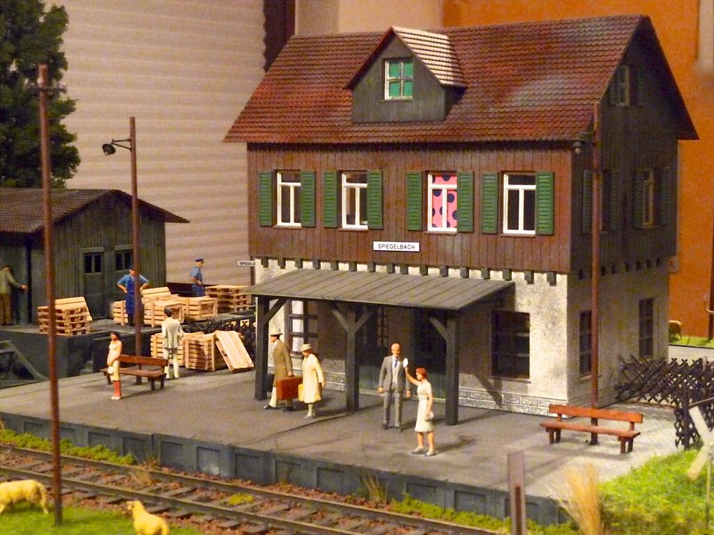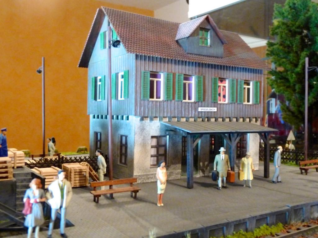 Nun habe ich es bei mir entsprechend an der Wand angebaut. Im Hintergrund des Dioramas der notwendige Spiegel aus dem Baumarkt, der eigentlich als Türspiegel verkauft werden sollte. Der Effekt der Spiegelung des Bahnhofs, des Güterschuppens und des Bahnübergangs mit Straße lässt aus den Gegenständen, die faktisch in Halbrelief ausgeführt sind, vollwertige ganze Objekte werden. Auch der sichtbare Teil des Bahnsteigs mit den Figuren und Autos im Spiegel führt zum Eindruck der Verdopplung, da man die Figuren einmal von vorne und dann einmal von hinten im Spiegel wahrnimmt. Auch die beiden flankierenden Bäume wirken deutlich wuchtiger. Ein zusätzlicher vergrößernder Effekt des Raums gesellt sich nebenbei dazu, da besonders in einem kleinen Raum die gegenüberliegende Wand auch gespiegelt wird; das Spiegelbild wirkt wie eine Art Fenster im Raum.