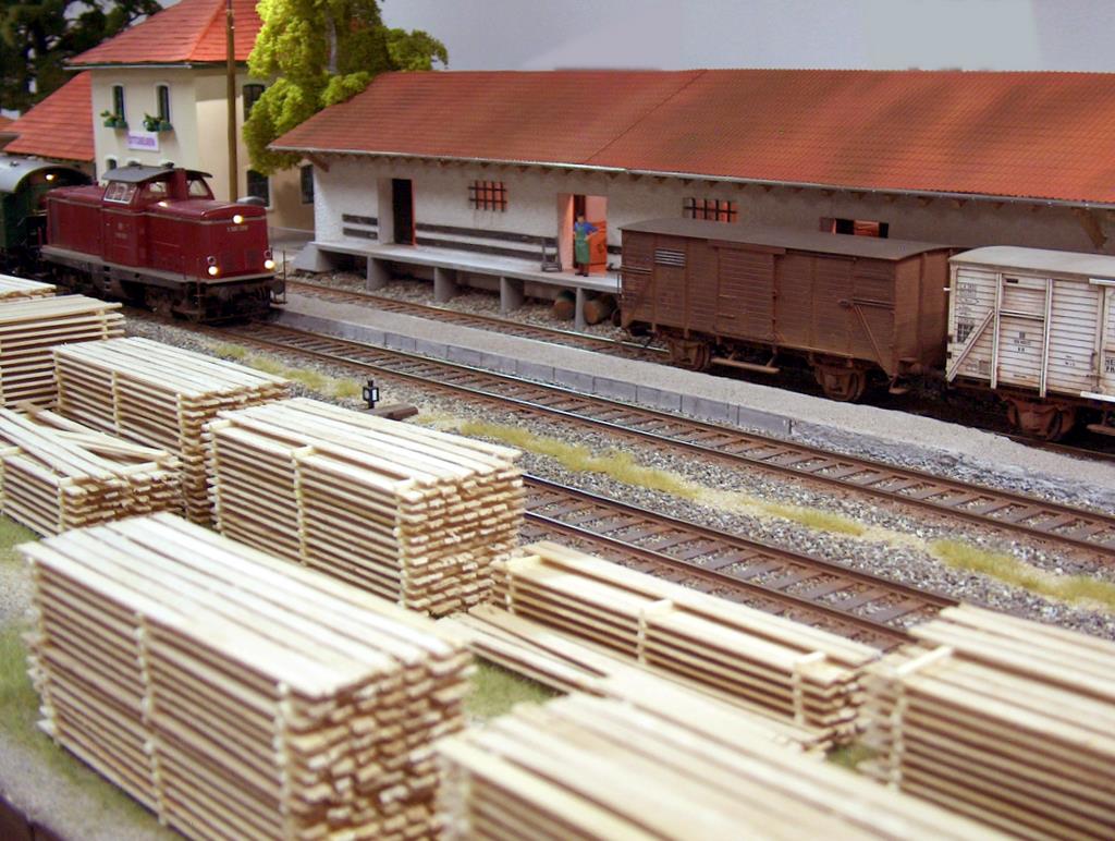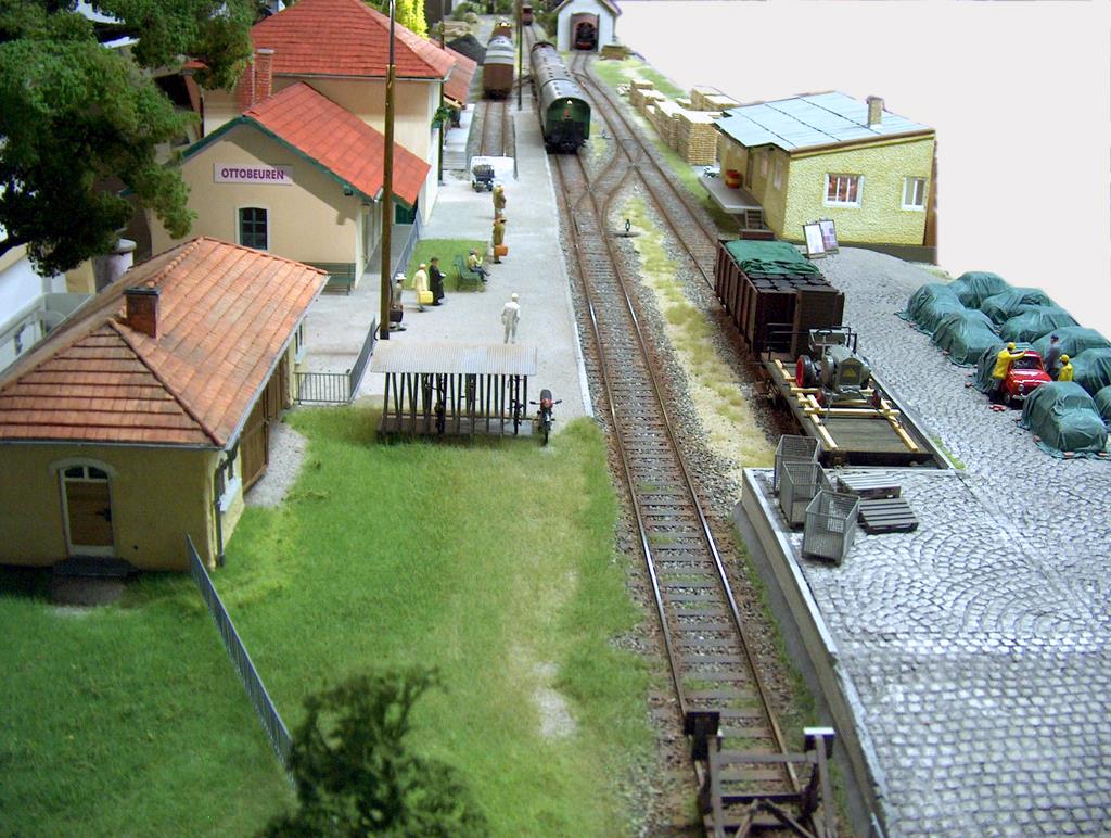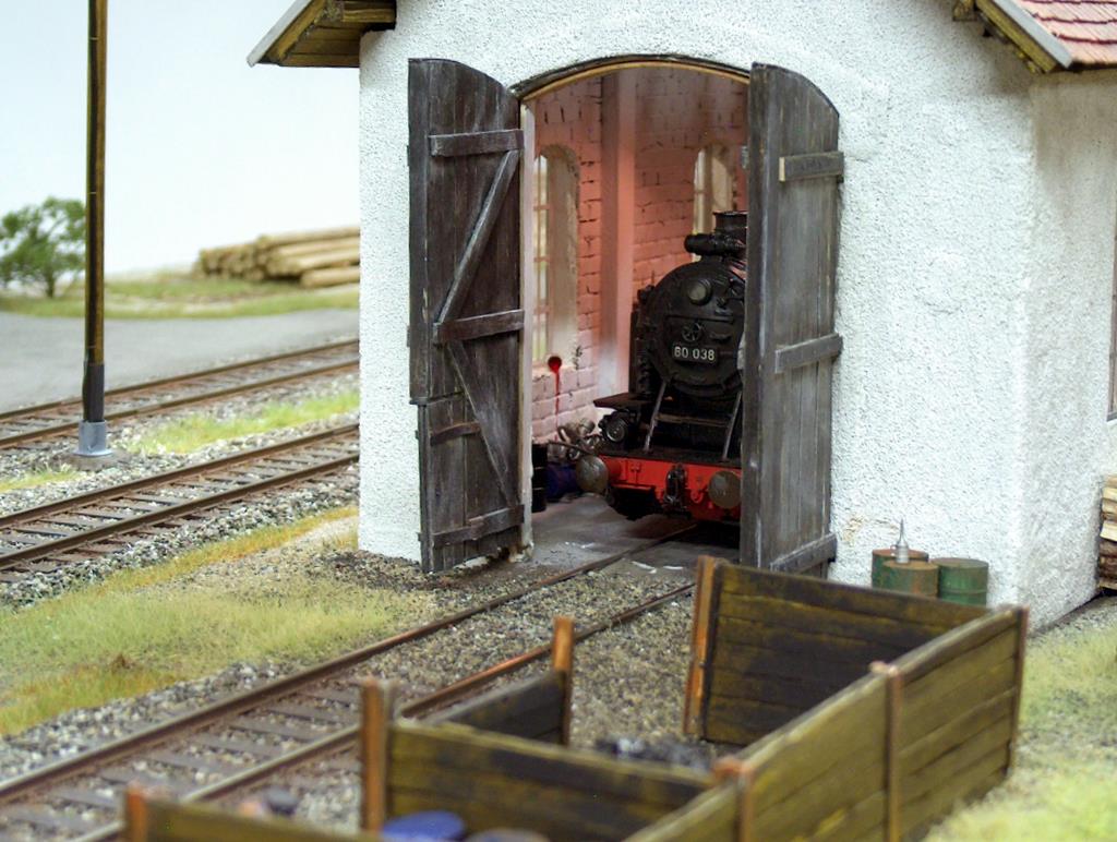 Die Gebäude entstanden in Eigenbau nach historischen Original-Plänen und Fotos. Die „Dachziegel“ vom Lokschuppen bestehen aus ca. 4500 einzeln geschnittenen und dann aufgeklebten Pappschindeln. Nur der Vollständigkeit halber wird erwähnt, dass selbstverständlich alle Gebäude Inneneinrichtung und Beleuchtung haben. Im Baywa-Lagerhaus, das zur Hälfte aufgeschnitten ist, wird demnächst noch ein funktionierender Aufzug seine Arbeit verrichten. Durch zwei Ausschnitte im Lokschuppendach kann man auch beobachten, wie an einer (nicht lauffähigen) Rivarossi BR80 geschweißt wird. Natürlich ist auch hier eine komplette Einrichtung vorhanden.