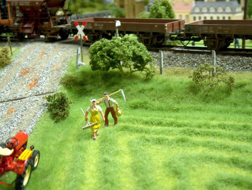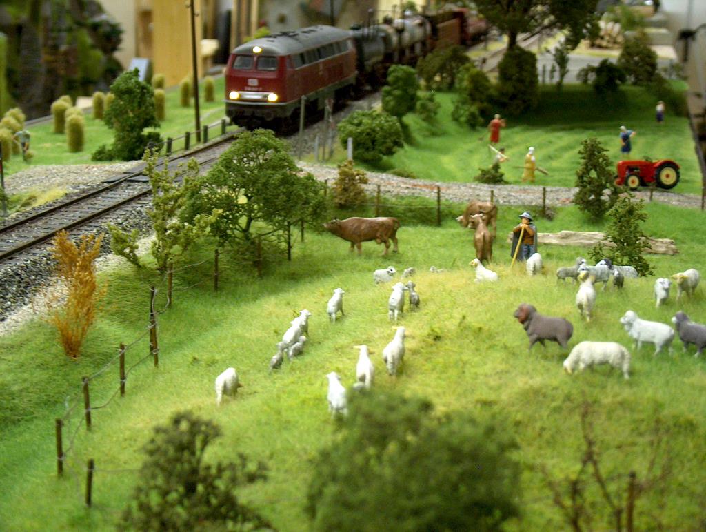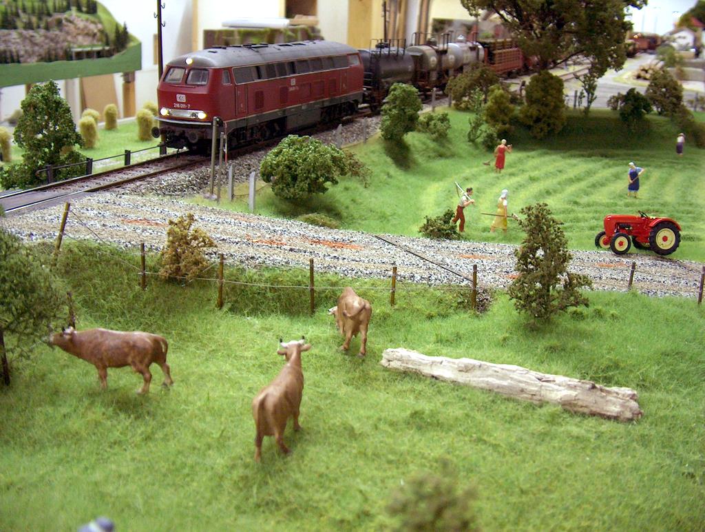 Das Gelände wurde mit Styrodur als Untergrund geformt. Bäume sind ebenfalls selbstgebaut, hier erwies sich der Umstand, dass die imposante Baumgruppe vor dem Bahnhof heute noch steht, als sehr hilfreich, da die Gruppierung und Lage bzw. der Stand der Bäume direkt nach Vorbild gebaut werden konnten. Der Gleisschotter ist in maßstäblicher Körnung, selbst gesiebt und gewaschen aus Splitt, der zum Einstreuen von einem neuen Parkplatz aufgeschüttet war.
