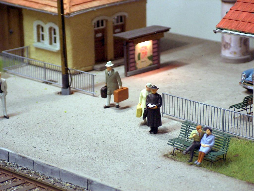 Eine besondere Problematik stellte der Zaun dar, der den Bahnsteig und das Betriebsgelände absperrte : es wurde damals Eisen-Rundmaterial verwendet. Und das galt es im Modell nachzubilden. Hier muss ich Günter Käsemann (Pseudonym heizero) erwähnen, der mir den Zaun aus 0,7 und 1mm Rundmessing sehr filigran zusammengelötet hat.