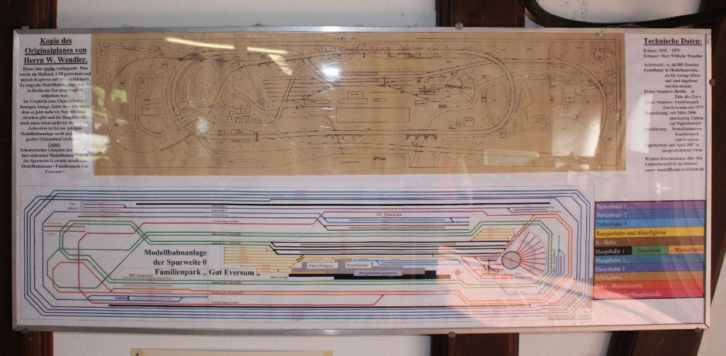 Was erwartet den Besucher, wenn er heute zur Spur-0-Schauanlage in den Freizeitpark Eversum kommt? Er bekommt neben den Attraktionen des Freizeitparks die wohl größte Spur-0-Schauanlage Deutschlands zu sehen, auf der 40 km Kabel verlegt sind, 3 km Schienen verbaut wurden. 62 Weichen sorgen für einen abwechslungsreichen Fahrbetrieb. Fünf Bahnhöfe, 1 Bahnbetriebswerk mit Drehscheibe und Lokschuppen, fünf Streckenwärterhäuser, 81 Signale und drei Signalbrücken dienen dem Fahrbetrieb. Auf der Anlage sind 400 Bäume, 150 Häuser, 2 Burgen, 3 Kirchen, 1 Sägewerk und unzählige selbstgeschnitzte Figuren zu finden. Die meisten Gebäude haben ein Vorbild irgendwo in Deutschlands, die „Hauptstadt“ der Anlage ist dem historischen Stadtkern von Rothenburg o.d. Tauber nachgebildet. Wer sich die Mühe macht, die 360 Quadratmeter der Anlage näher zu betrachten, wird zwei Schornsteinfeger bemerken, die sich bewegen und die Schornsteine reinigen. An anderer Stelle schüttelt ein Müller seine Mehlsäcke aus, winken Passanten den vorbeifahrenden Zügen zu oder sieht man die Menschen im Sägewerk arbeiten. An anderer Stelle gießt eine Frau unaufhaltsam die Blumen und lässt sich von den vorbeifahrenden Zügen nicht ablenken. Dass sich die Schranken an den Bahnübergängen vorbildgerecht senken und öffnen, bedarf wohl keiner besonderen Erwähnung.
