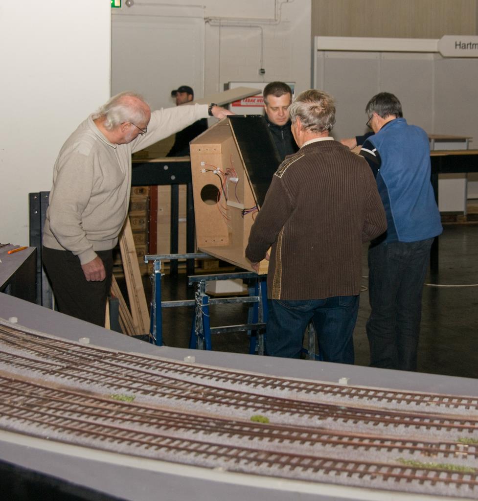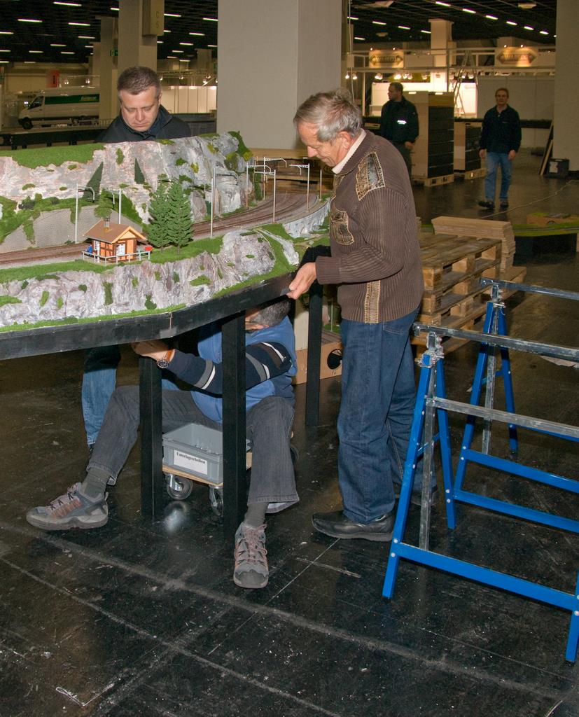 Sonntag um 17.00 Uhr: Ende der Messe: Der Abbau begann, vierzehn flinke Hände waren in Aktion. 42 Loks, 150 Wagen entkuppeln und in die Kisten legen, lose Teile und Oberleitungsmasten von den Modulen entfernen, Elektro- und IT Anschlüsse trennen, die Module voneinander schrauben, Transportbretter anschrauben, die Module auf die Paletten stapeln und mit Spanngurten befestigen, das ganze mit Plastikfolie umwickeln und bereitstellen für den Transport. Um 21.45 Uhr war alles fix fertig, wir auch.