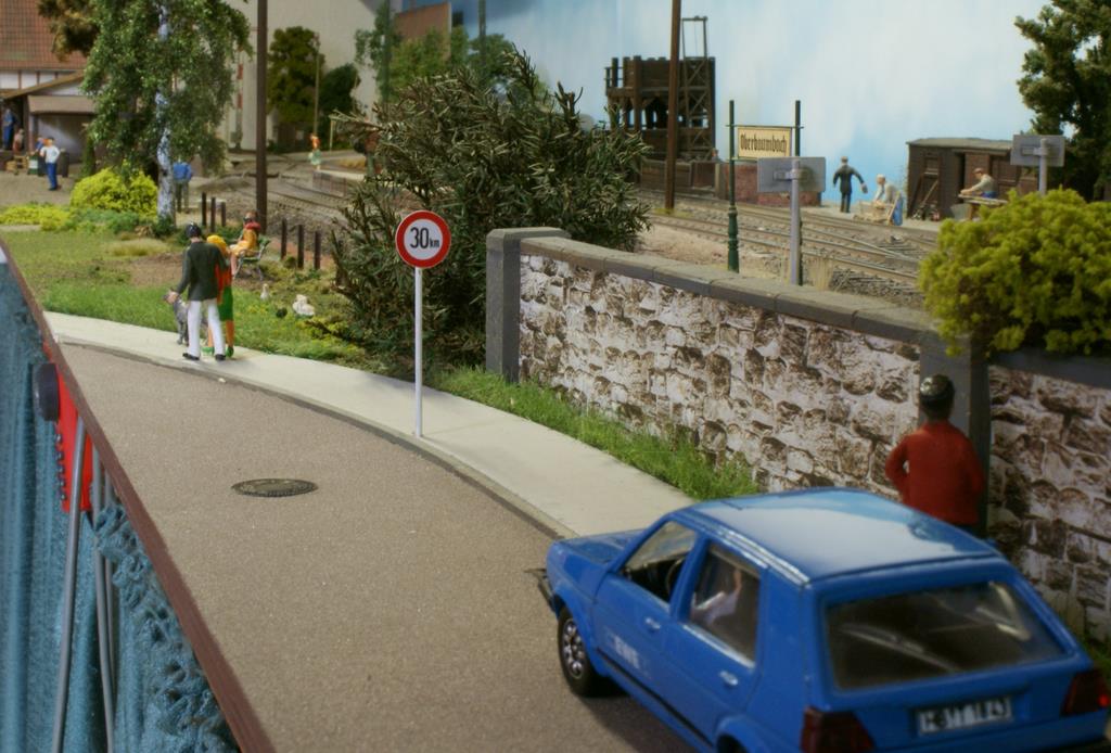 Kaum ist das neue Straßenstück fertig gestellt, schon rollt der Verkehr. Und mancher schafft es nicht bis zum Bahnhof mit seinem neu umgebauten WC, sondern hält mit quietschenden Reifen am Gehweg, um dort die Bruchsteinmauer zu besprengen. Da wächst kein Gras mehr…