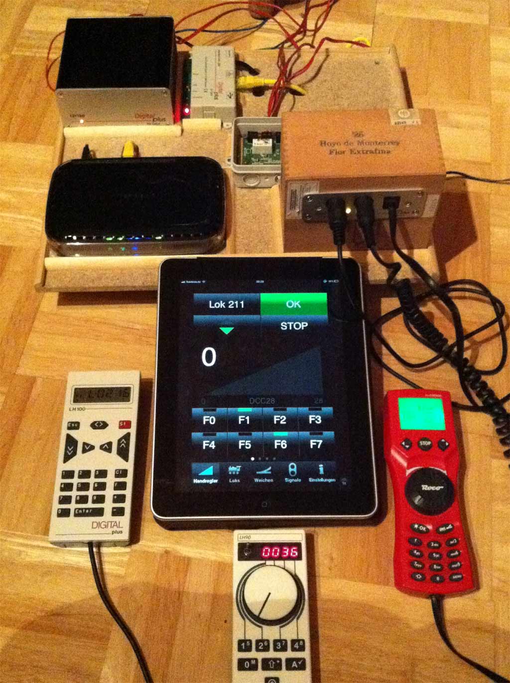 Als ich das Foto vom Wirrwarr des Geräteaufbaus sah, schaute ich mir schnell und dankbar meine Roco Multimaus pro an: ein Trafo, eine kleine Zentrale, ein Handregler – fertig. Kann sogar Doppeltraktion, Decoder auslesen und programmieren. Und alles leicht verständlich!