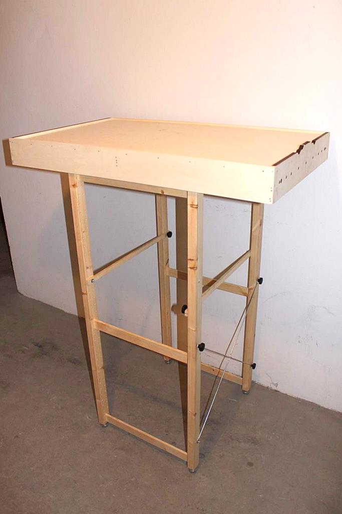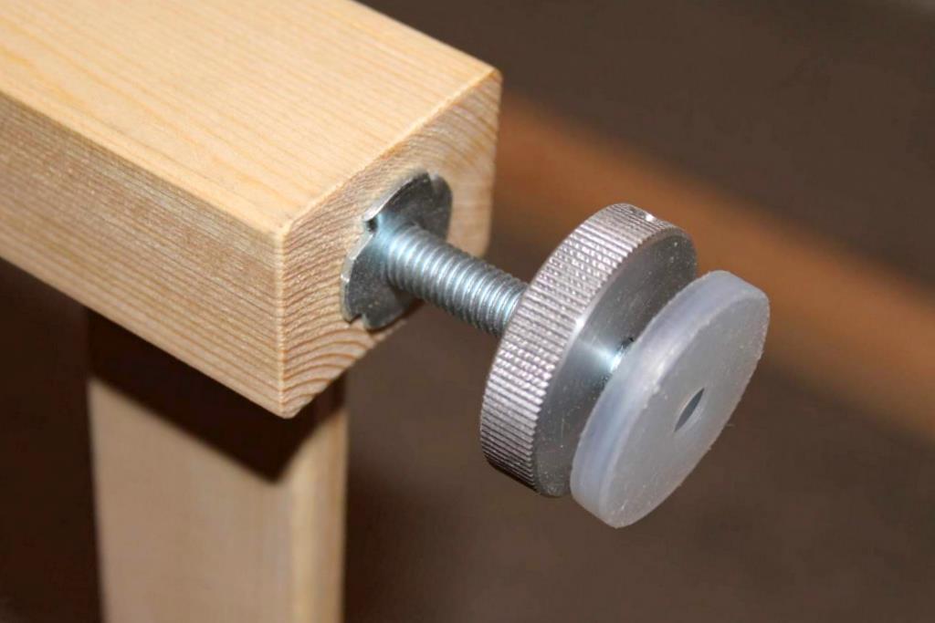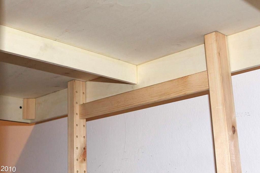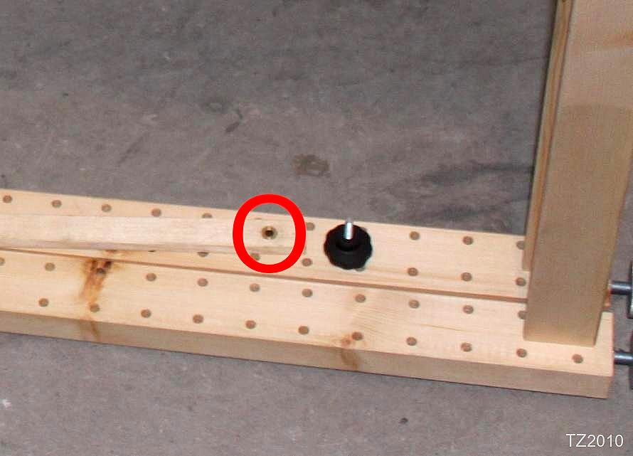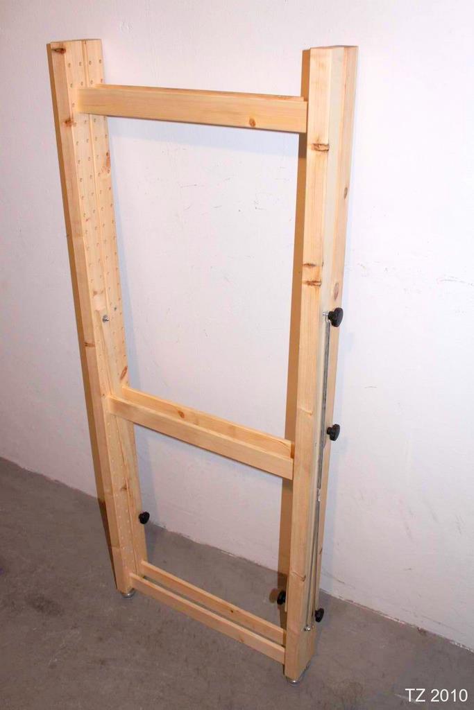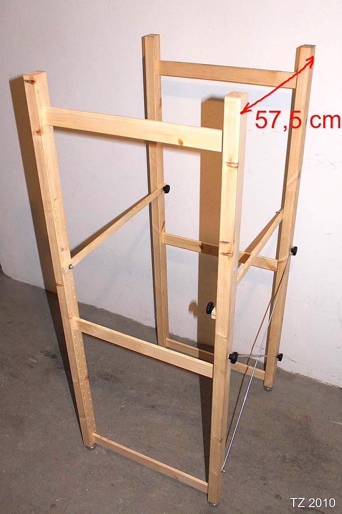 Jedes Beinpaar besteht aus einem kompletten Ikea Ivar Regalrahmen: Zwei stabile Kanthölzer sind mit drei Querstreben oben, unten und etwas unterhalb der Mitte miteinander verbunden. Im unteren Teil der Regalbeine sind, wie bei einem Regal üblich, Lochreihen eingebohrt. Sie nehmen normalerweise für die Halter für die Regalbretter auf, in diesem Falle werden die hölzernen Querstreben, hier sind sie 57,5 cm lang dort eingeschraubt. Das Ikea Spinnenkreuz dient der Versteifung und Stabilisierung. Es nicht wie üblich mit Holzschrauben, sondern mit den Schraubgriffen und den eingesetzten Rampa Muffen verschraubt. Rampa Muffen sind Muttern, die Außen ein Holzgewinde, und innen ein Maschinengewinde haben – siehe unten.