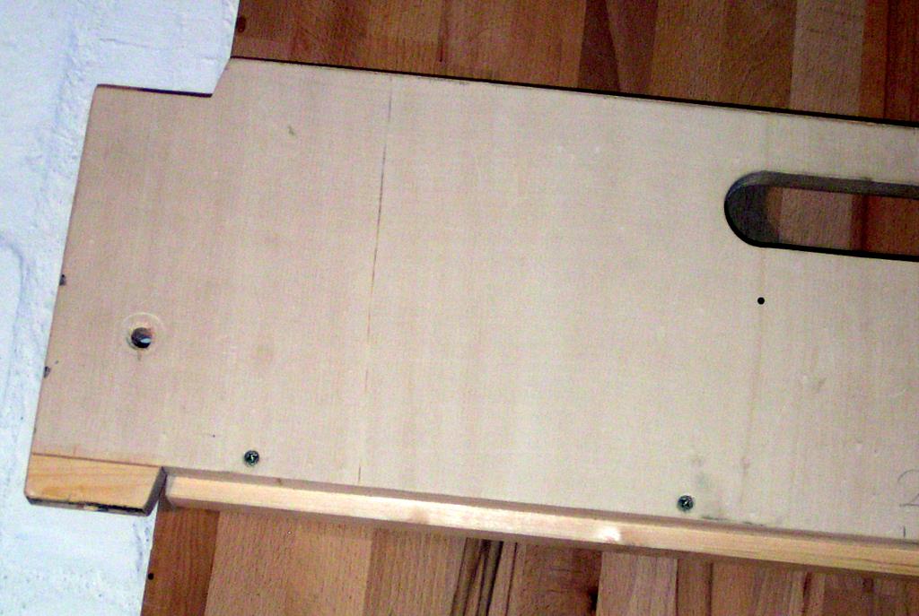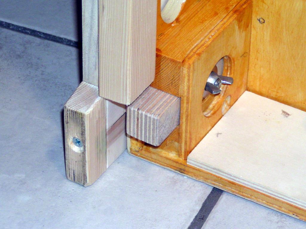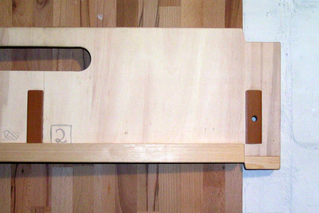 Aus den 80 cm breiten rechtwinkligen Platten werden am oberen Ende zwei „Innenecken“ herausgearbeitet. Nach innen hin werden diese Aussparungen zum besseren Aufeinandersetzen abgeschrägt. Mit den Maßen dieser „Innenecken“ werden aus ebenso stabilen 20/22mm starken passenden Leisten die Gegenstücke hergestellt. Diese werden verleimt und verschraubt auf das untere Ende des Holzes aufgebracht. Man kann natürlich den dadurch entstehenden Ausschnitt auch sägen, dass ist nur erheblich mühevoller.