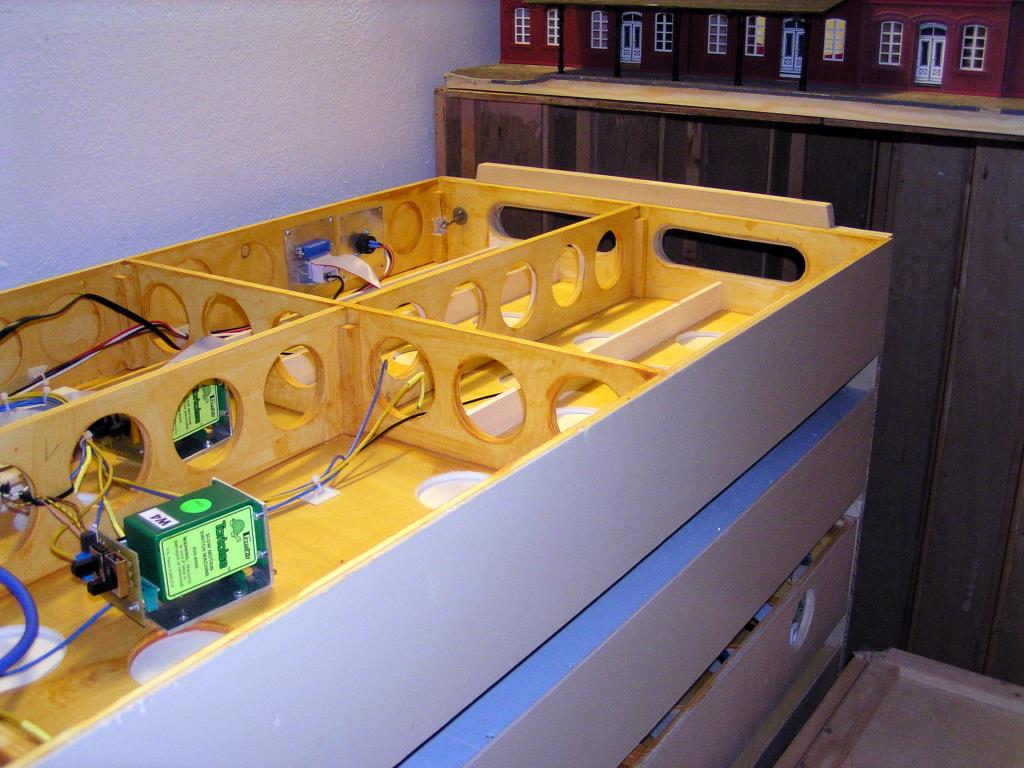 Daneben sieht man einerseits eins der wenigen nur einzeln zu transportierenden Module (Modul 7, die westlich Bahnhofsausfahrt mit der alten Backsteinbrücke) und die, quasi ein Rückfall in alte Zeiten, im Doppelpack gestapelten Module. Hier haben wir das Konzept, mit 60 cm Breite, für die neuen Module des Abstellbahnhofes wieder etwas modifiziert. Aufgrund der ultraleichten Modulbauweise und der nicht vorgesehen „Hochbauten“ wurden jeweils zwei Module wie früher als ein Paket zusammengestellt. Die Schienenoberseiten sind einander zugewandt. Trotz des „Doppelpacks“ bleiben die Module dabei sehr leicht tragbar.