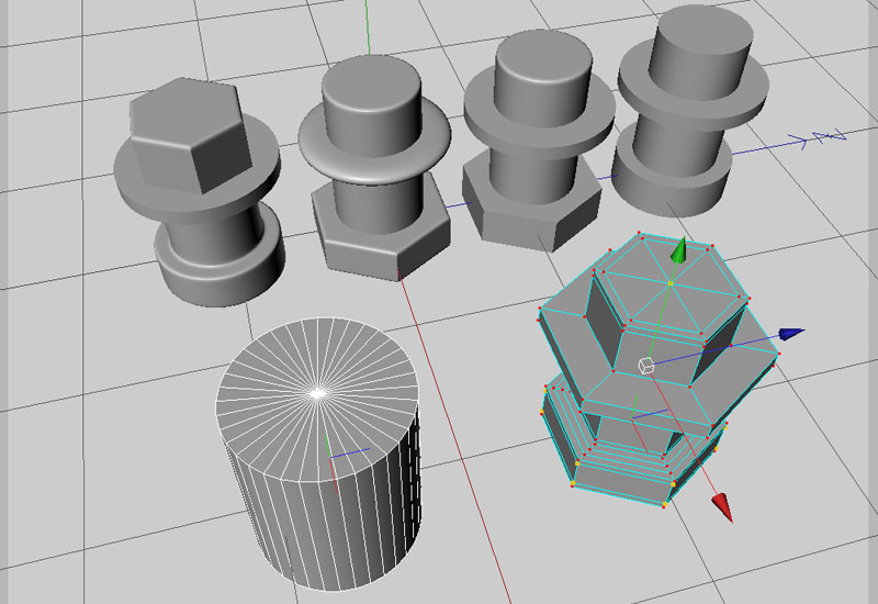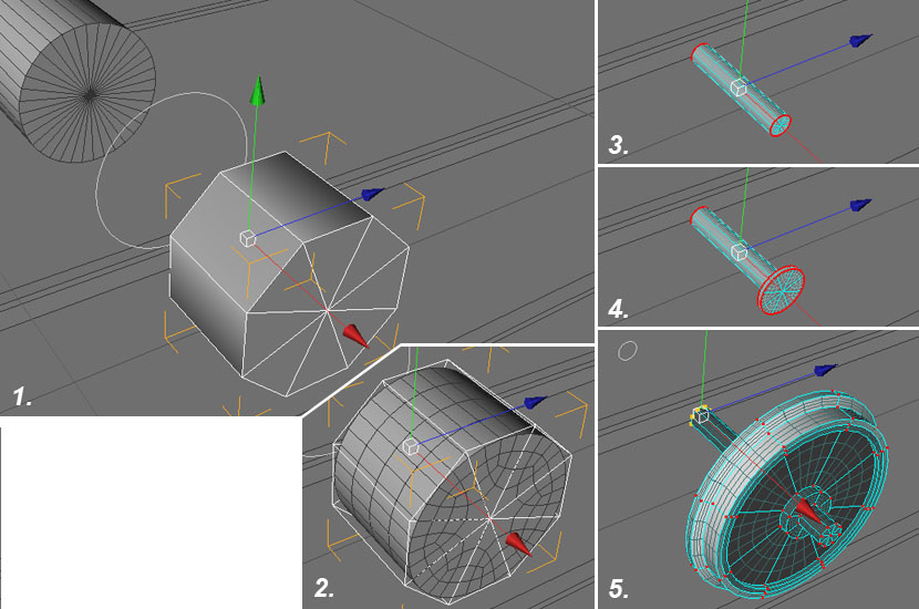 An Fahrzeugen benötigt man häufig runde Elemente, z.B. für Räder, Waggondächer und ähnliches. Geeignetes Grundobjekt hierfür ist ein Zylinder, der diesmal öfter zum Einsatz kommt. Standartmäßig benötigt ein Zylinder viele Unterteilungen (Polygone) des Umfangs, damit er rund dargestellt wird. Mit Hilfe eines so genannten HyperNURB-Objektes kann man diese Anzahl reduzieren, z.B. auf sechs oder acht Polygone, wobei die Zylinderkanten durch das HyperNURB gerundet werden. Es ermöglicht aber auch, gerundete und winklige Kanten in einem einzigen Objekt frei zu kombinieren.