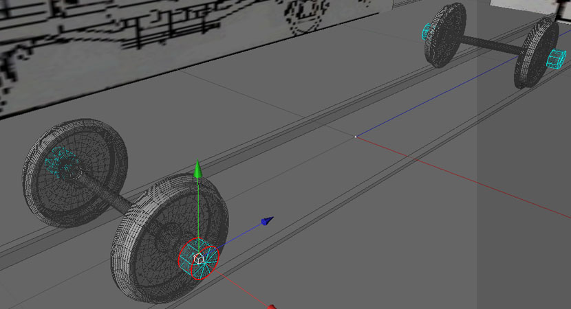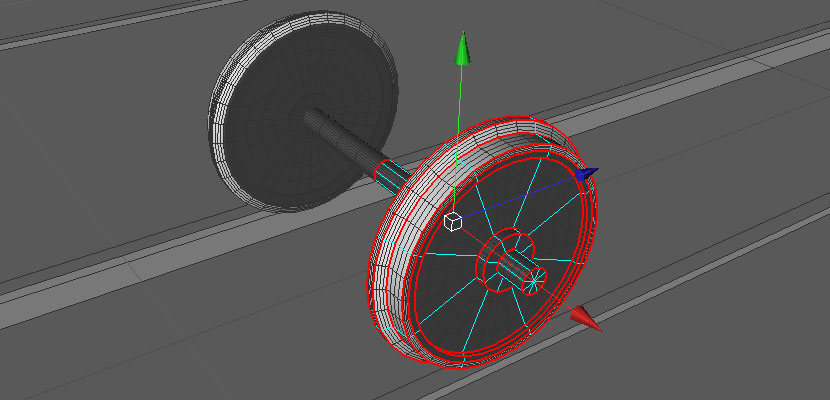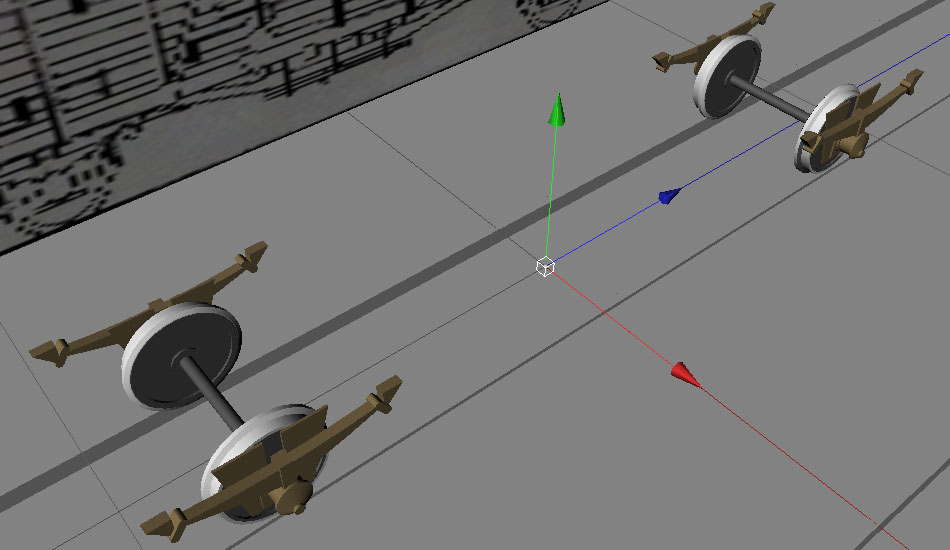 Wie zu sehen ist, wird der Radsatz nur bis zur Mitte konstruiert. Den Rest erhält man durch ein Symmetrieobjekt – der Vorteil: man muss nur die Hälfte eines Elementes gestalten, alles andere wird vollkommen exakt gespiegelt. Auch der zweite Radsatz wird mit einem Symmetrieobjekt realisiert.