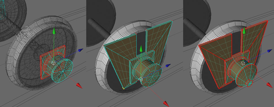 Ein weiterer Zylinder bildet die Achslagerung (Extrudieren). Jetzt kommt das Schöne: Ein Zylinder in einem HyperNURB muss nicht ewig rund bleiben. Es können wiederum einzelne Punkte verschoben werden, die betreffenden Kanten werden in diesem Fall winklig, und es entsteht das Achshalterblech.