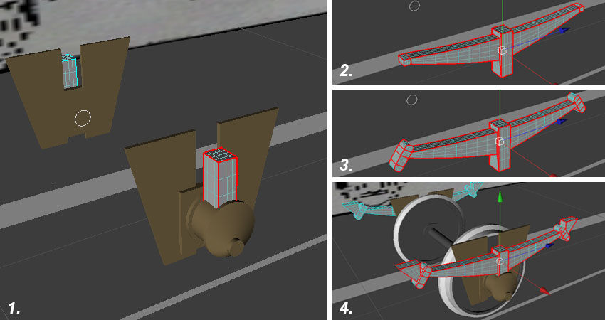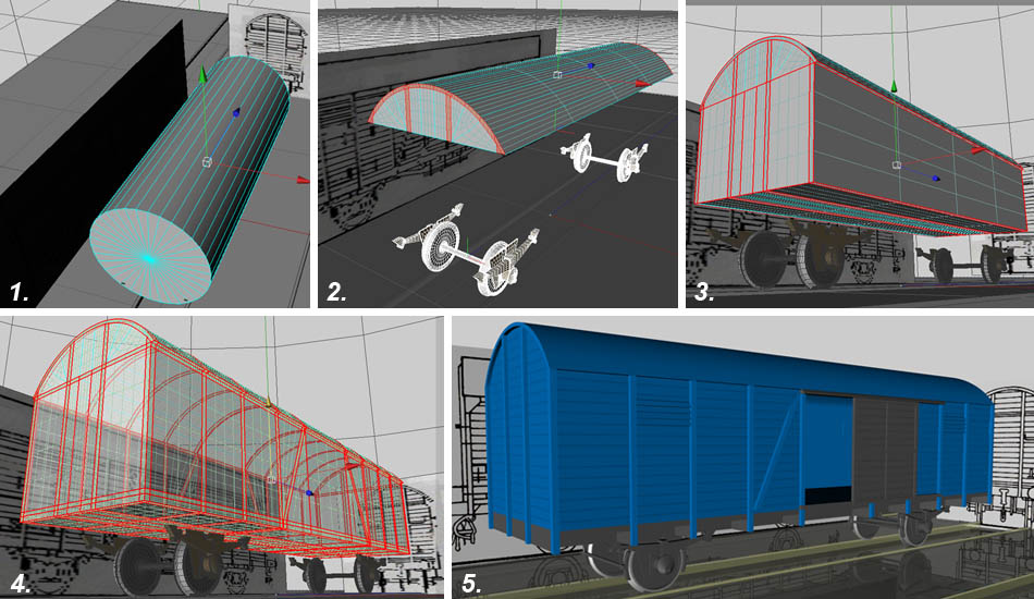 Der Wagenkasten entsteht wieder aus einem Zylinder, der zuerst an die Dachform angepasst wird (1). Zeichnungen von Stirn- und Seitenansicht sind als Material auf separate Ebenen projiziert worden. Diese werden etwas nach links und hinten verschoben. Die Ebenen dienen später als Hilfsmittel beim Gestalten der genauen Formen (wie eine Schablone, die im Hintergrund steht).