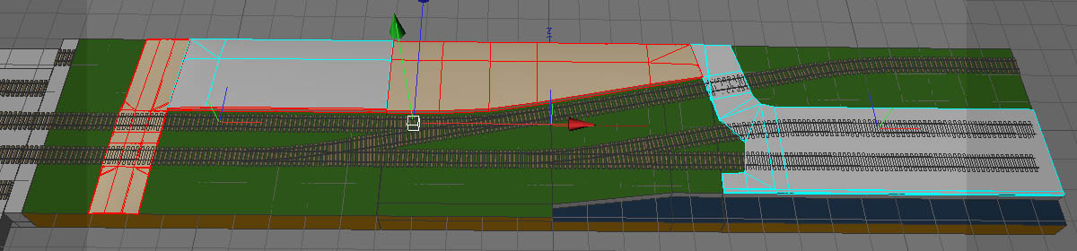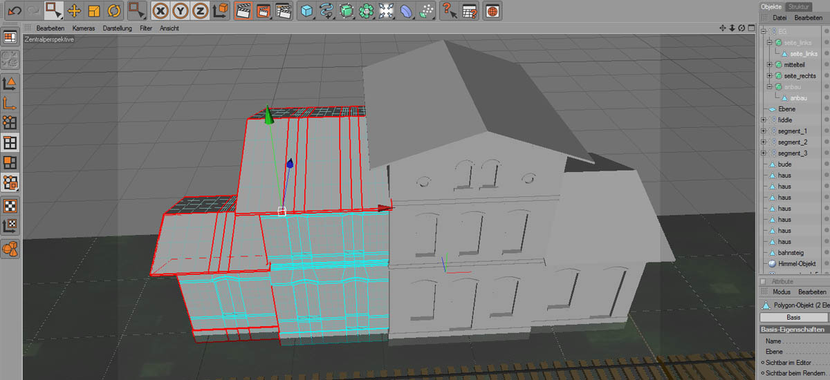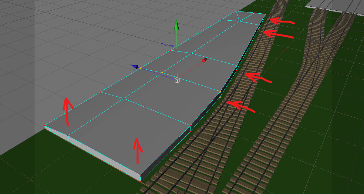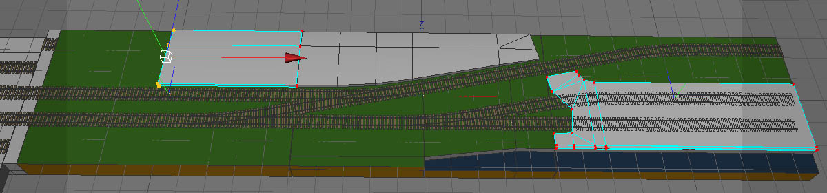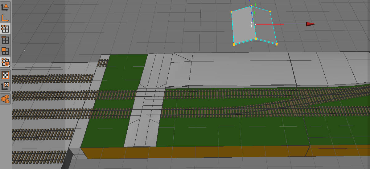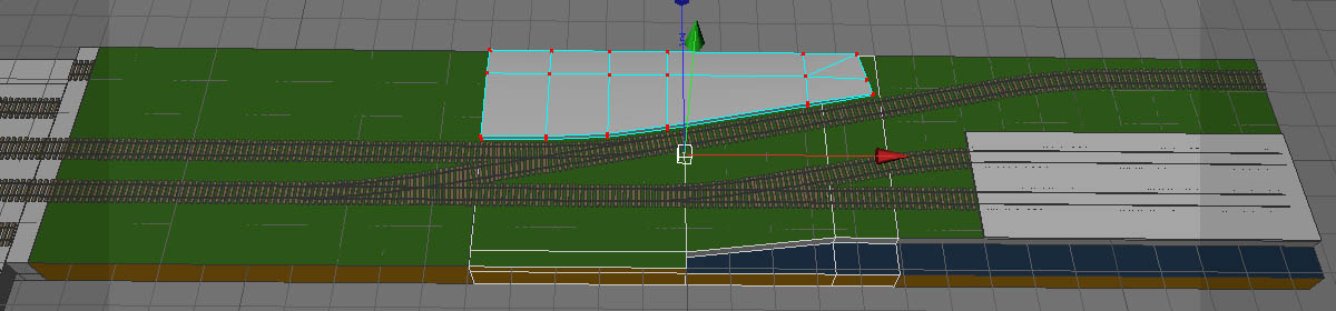 Beim Bahnsteig ist dies bereits angedeutet. An zusätzlichen Einteilungen des Körpers (die man mit einer „Messer“-Funktion sehr einfach herstellt) bilden sich Netzgitter und Punkte. Diese werden entsprechend der gewünschten Form (beim Bahnsteig auch in der Höhe) verschoben.