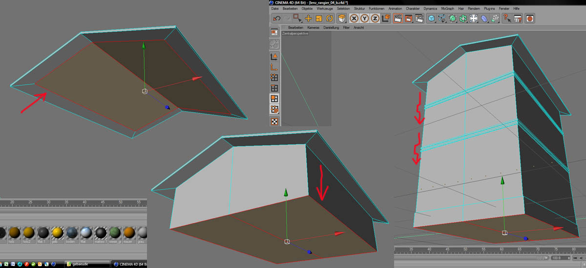 Die Dicke des Würfels wird noch angepasst, der Würfel in ein Polygonobjekt umgewandelt, und schon kann durch verschieben einiger Punkte das Dach geformt werden.