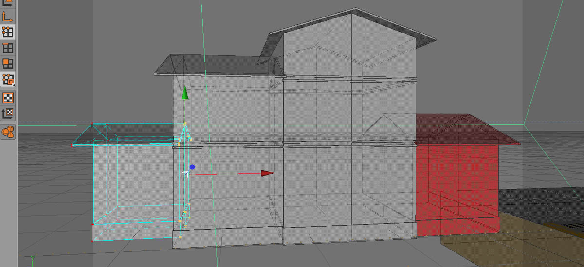 Die zwei Polygone an der Unterseite des Daches werden markiert, und mit einfachen Funktionen bearbeitet (Innen Extrudieren und Extrudieren), wodurch relativ schnell der Grundkörper des Hauses entsteht.