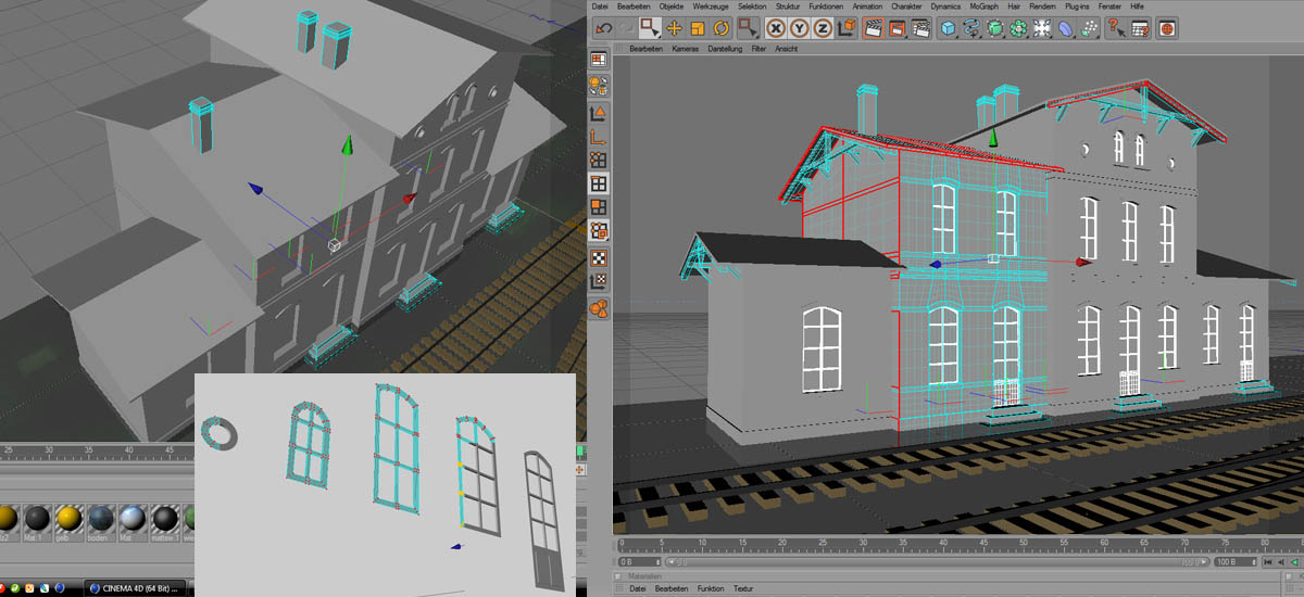 Alles besteht aus Würfeln mit zusätzlichen Unterteilungen, so dass durch Verschieben von Punkten oder Extrudieren die entsprechende Form gebildet wird. Wenn man ganz viel Zeit hat, könnte man ja auch noch Regenrinnen usw. anbringen…
