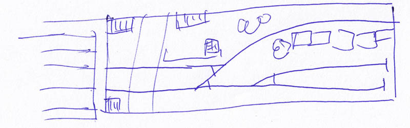 Am Anfang steht natürlich immer erst einmal eine Grundidee. Für dieses Beispiel soll es erst einmal sehr einfach sein, wenig Weichen, wenig Platzbedarf, etwas zum Rangieren. Auf einer englischen Website sah ich einmal einen Gleisplan, wie ich ihn hier ähnlich skizziert habe: