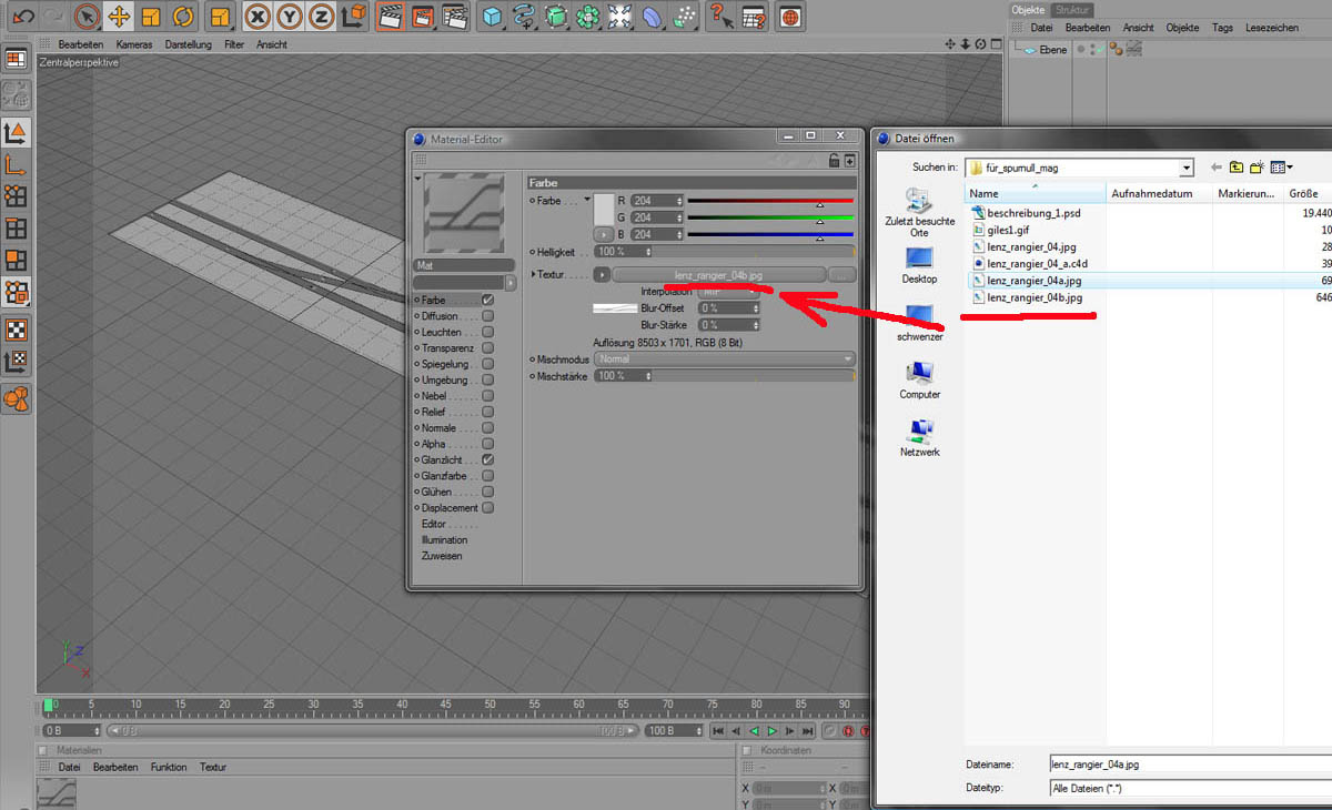 Der eben angefertigte Gleisplan wird im 3D-Programm als Vorlage für die Gleisführung benötigt. Dazu wird eine Ebene mit der Abmessung der geplanten Anlage gezeichnet. Man erstellt ein „Material“, in das man den Gleisplan als jpg.Datei eingibt. Das Material wird auf die Ebene projiziert.