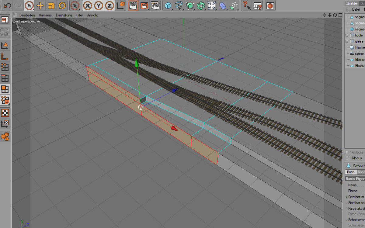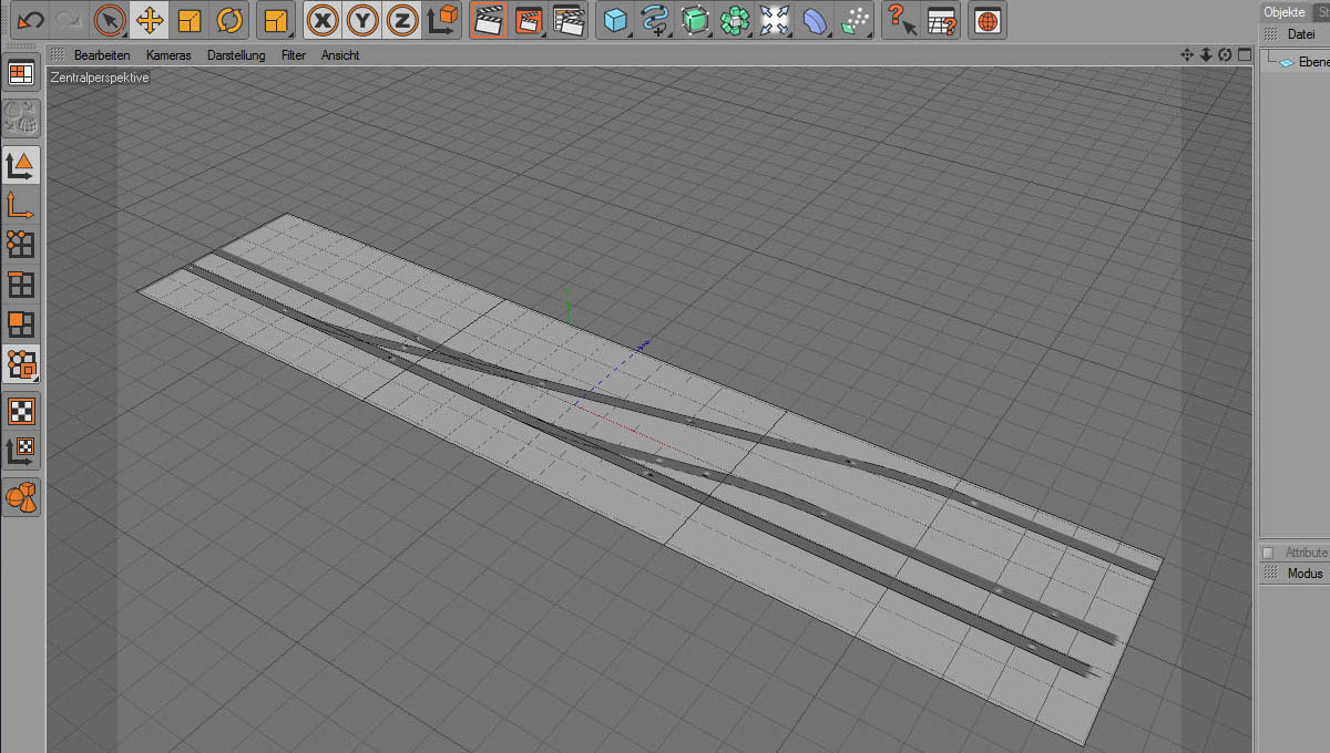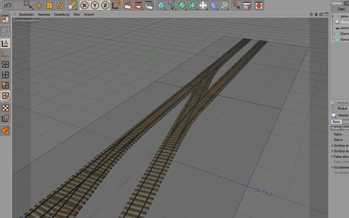 In der Abbildung ist die ursprüngliche Ebene mit dem Gleisplan noch sichtbar. Für die weiteren Schritte kann sie ausgeblendet werden (nicht löschen, vielleicht muss man ja noch etwas vergleichen).