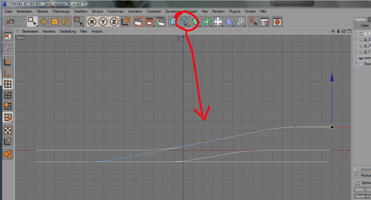 Das Spline-Werkzeug arbeitet genau so wie das Werkzeug für Bezier-Kurven in Vektorprogrammen (z.B. Illustrator oder CorelDRAW – alternativ hätte man solche Bezier-Kurven auch aus diesen Programmen importieren können).