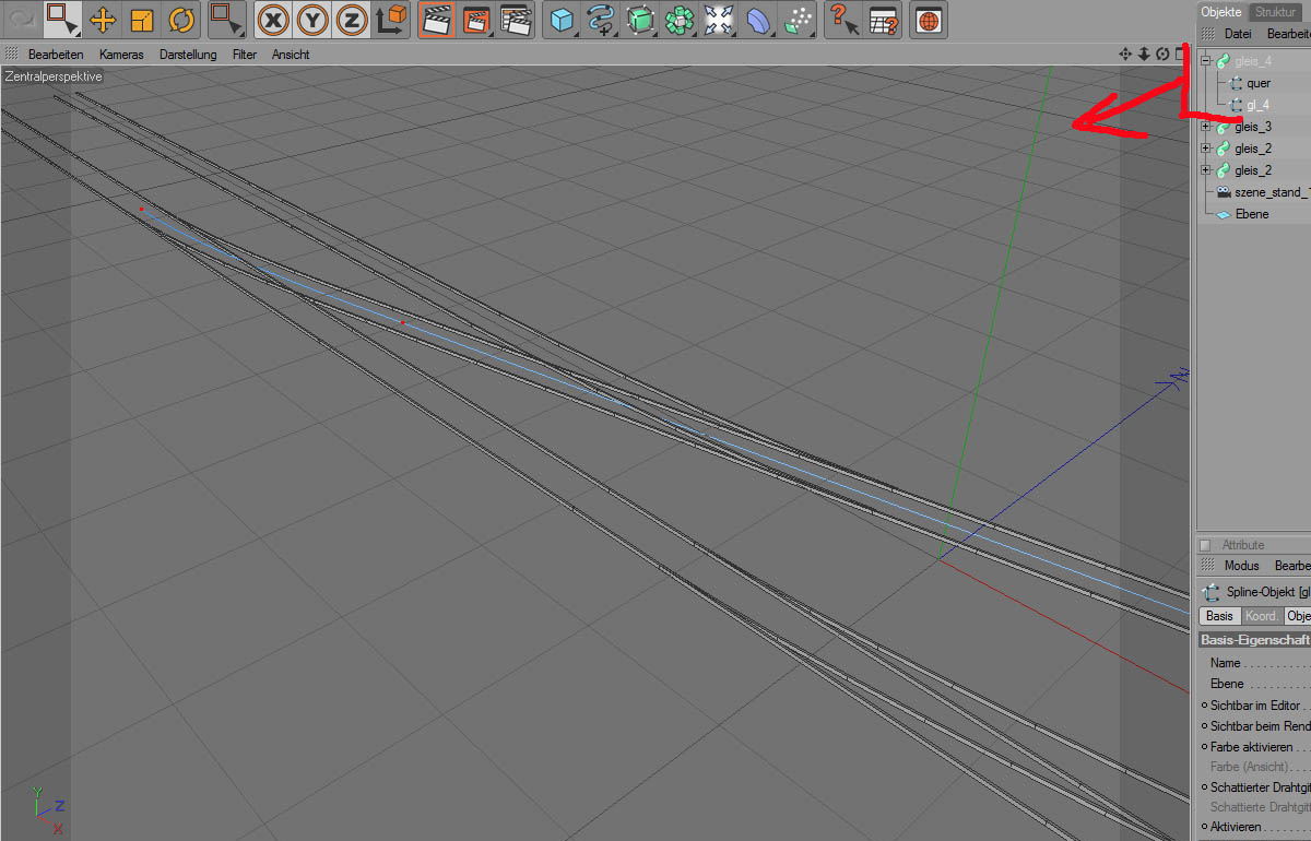 3D-Programme erlauben die Einstellung der verschiedensten Blickwinkel und Ansichten. Man stellt die Draufsicht ein, und kann mit einem Spline-Werkzeug die Gleise nachzeichnen, hierbei reichen die Mittellinien. Zur besseren Übersicht ist hier die Ebene schon ausgeblendet (d.h. unsichtbar – nicht gelöscht – man könnte sie noch brauchen). Durch das Zeichnen in der Draufsicht kann man die Linienführung gut auf die Vorlage abstimmen, und die Splines werden in der Höhenlage automatisch auf die Null-Ebene ausgerichtet, werden also völlig eben.