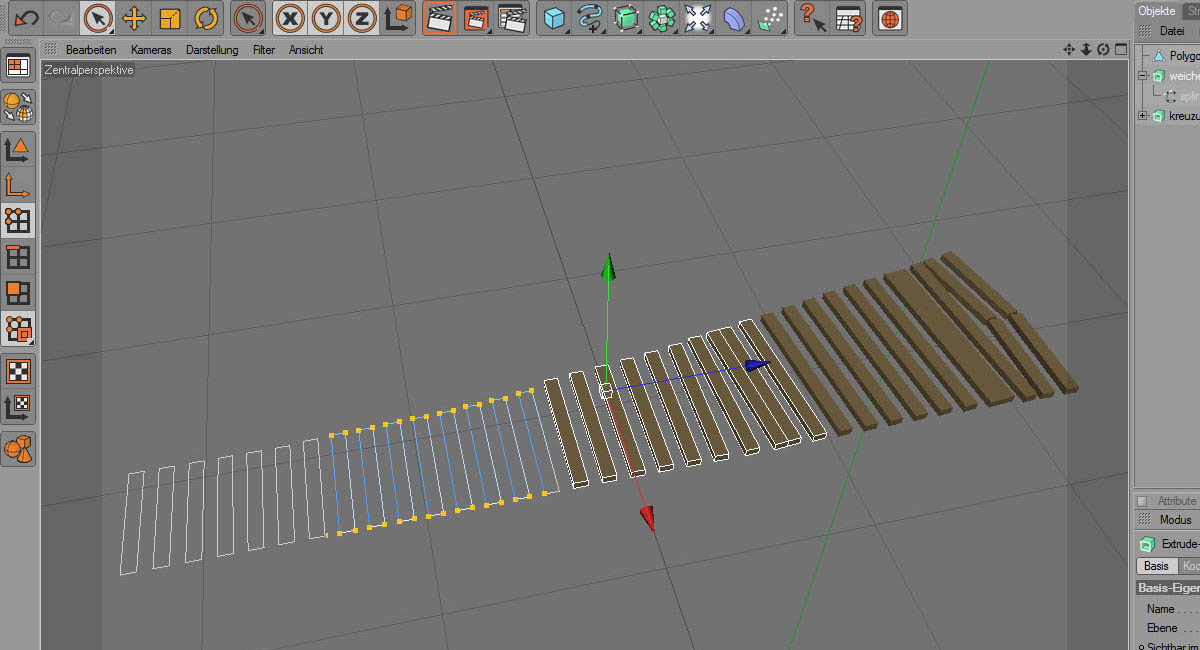 Im Beispiel wurde die Schwellenlage einer Lenz-Weiche mit Adobe Illustrator gezeichnet(CorelDRAW oder Freehand geht auch). Diese Kurven muss man als ai.dateien speichern oder exportieren und kann sie wie normal gezeichnete Splines im 3D-Programm weiterverwenden (auch mit den Schienen wäre das möglich gewesen, deshalb hatte ich bisher Gleispläne lieber mit Vektorprogrammen konstruiert). Die weiteren Schritte sind zu sehen: die Splines kommen in ein EXTRUDE-NURBS-Objekt, wodurch sie ihre Dicke erhalten. Sie wurden auch schon mit einer Farbe versehen, dazu später mehr.
