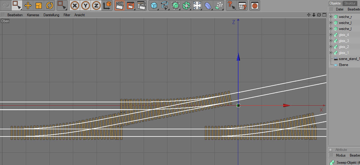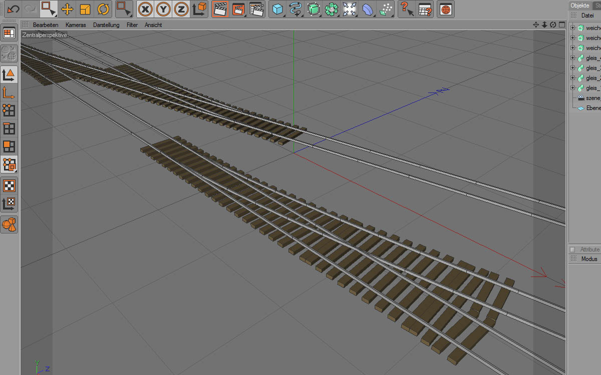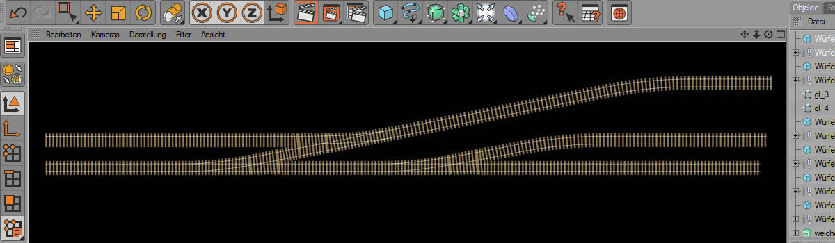 Es dauert fast länger, es zu beschreiben als zu konstruieren: Ein Quader von der Größe der Schwellen wird mit einem Instanzwerkzeug an den schon vorhandenen Splines entlang vervielfältigt – man muss nur darauf achten, dass die Schwellenabstände stimmen – und schon ist die Gleisanlage fertig.