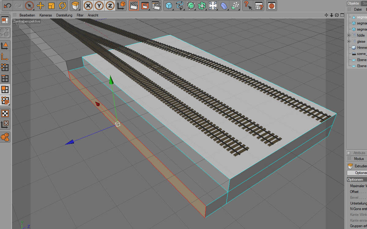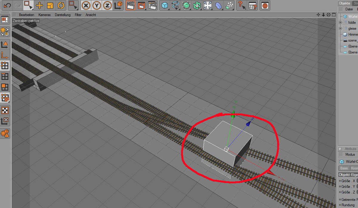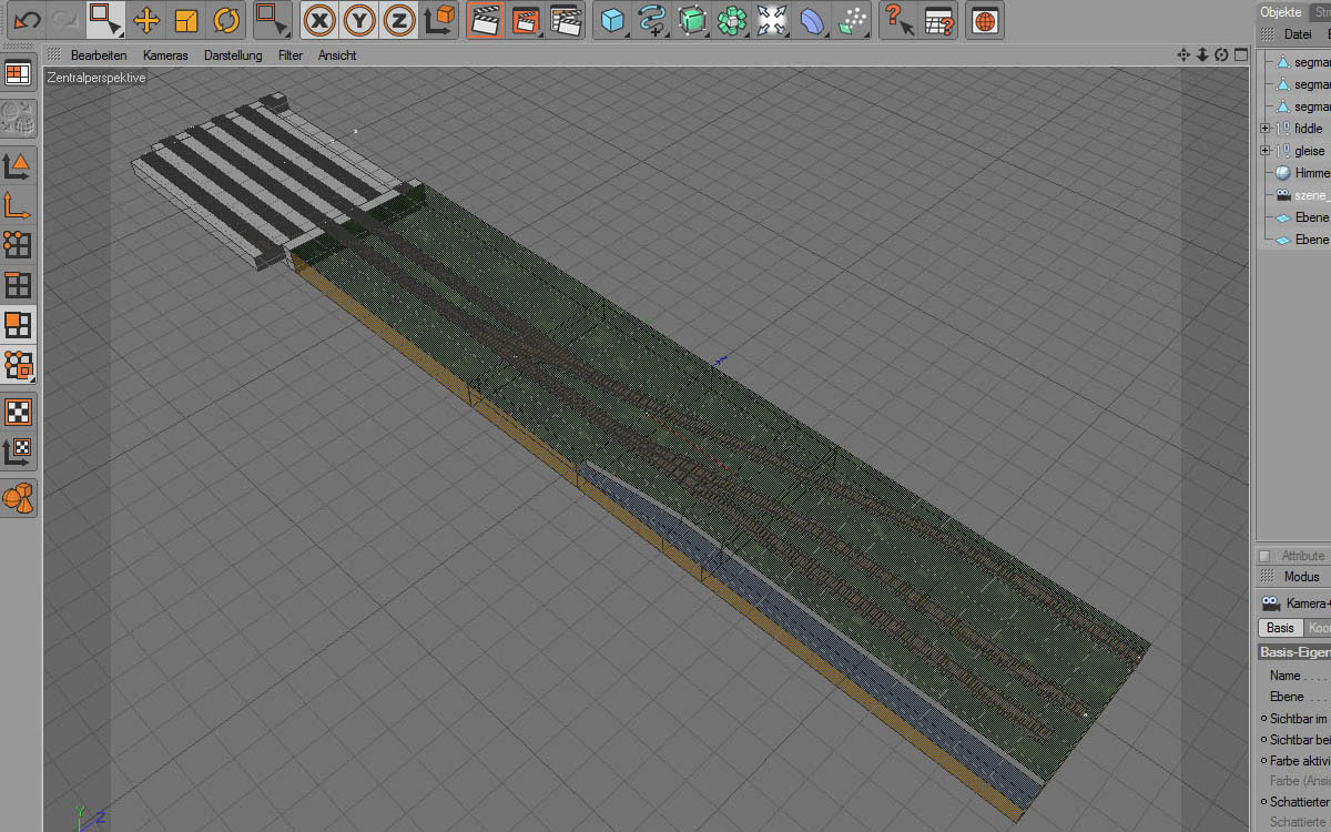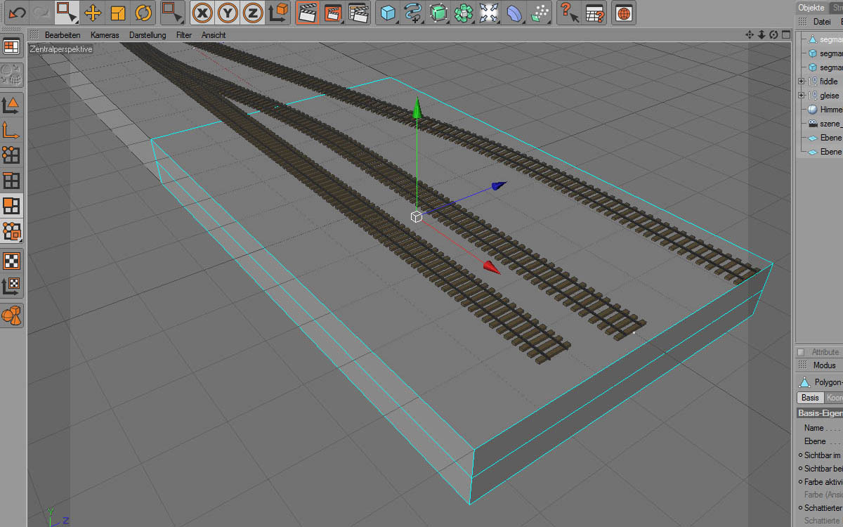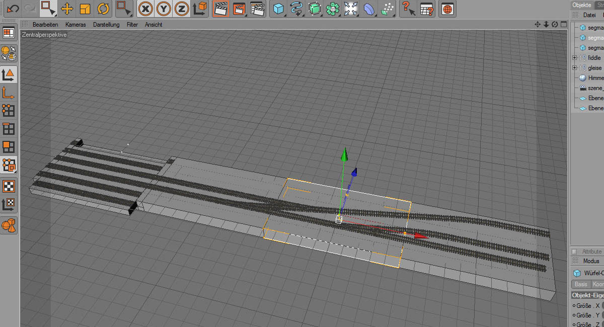 Jetzt muss zu der Gleisanlage noch das räumliche Umfeld konstruiert werden. In 3D-Programmen werden viele Objekte aus geometrischen Grundobjekten (Würfel, Zylinder, Kugel usw.) gebildet, die entsprechend angepasst und verändert werden müssen.