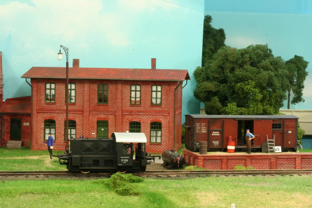 Das Klappern des Teeservices mit der Aufforderung zum sofortigen Erscheinen an der Kuchentafel reist mich aus meiner Träumerei und ich lande wieder in der Realität. Schade, eigentlich hätte alles so schön und einfach sein können. Jedoch fahren meine Fahrzeuge weder mit der Kadee- noch mit der Hakenkupplung, sondern mit der Schraubenkupplung. Und diese ist beim allgemeinen Rangiergeschäft recht unkomfortabel. Zudem müssen bei mir noch die Dampf- Exportbier Brauerei Stargard, sowie die städtische Gasanstalt täglich an einer nicht zugänglichen Stelle angefahren werden.