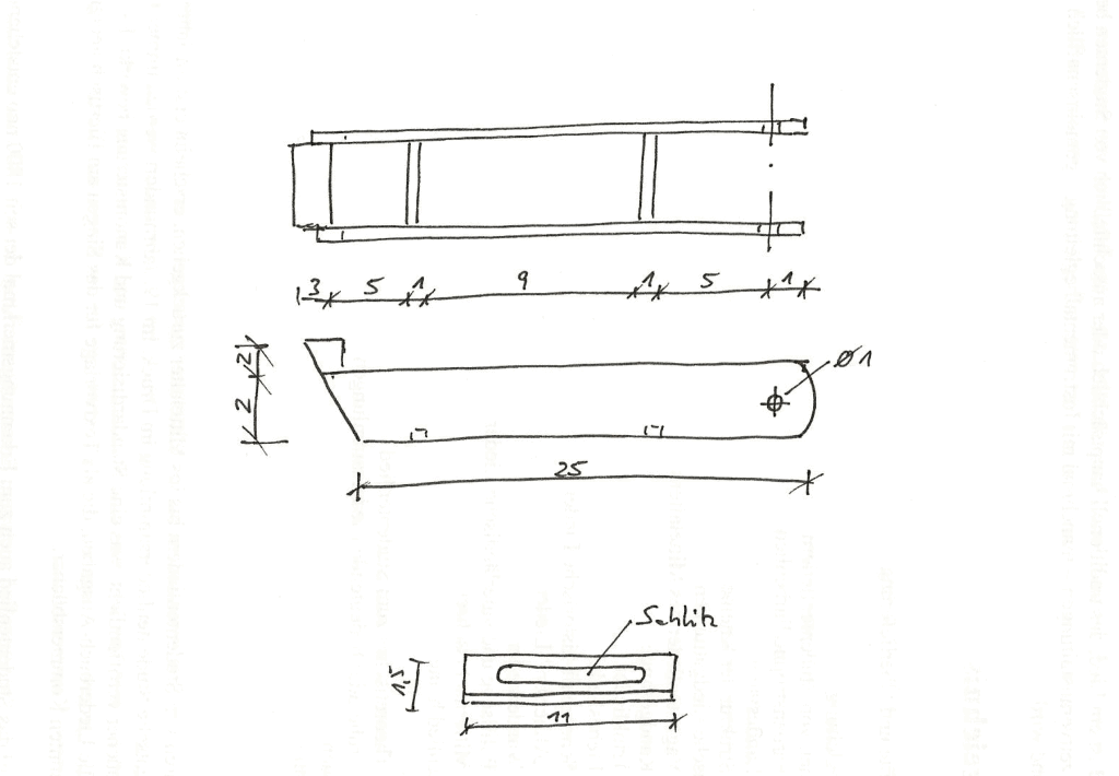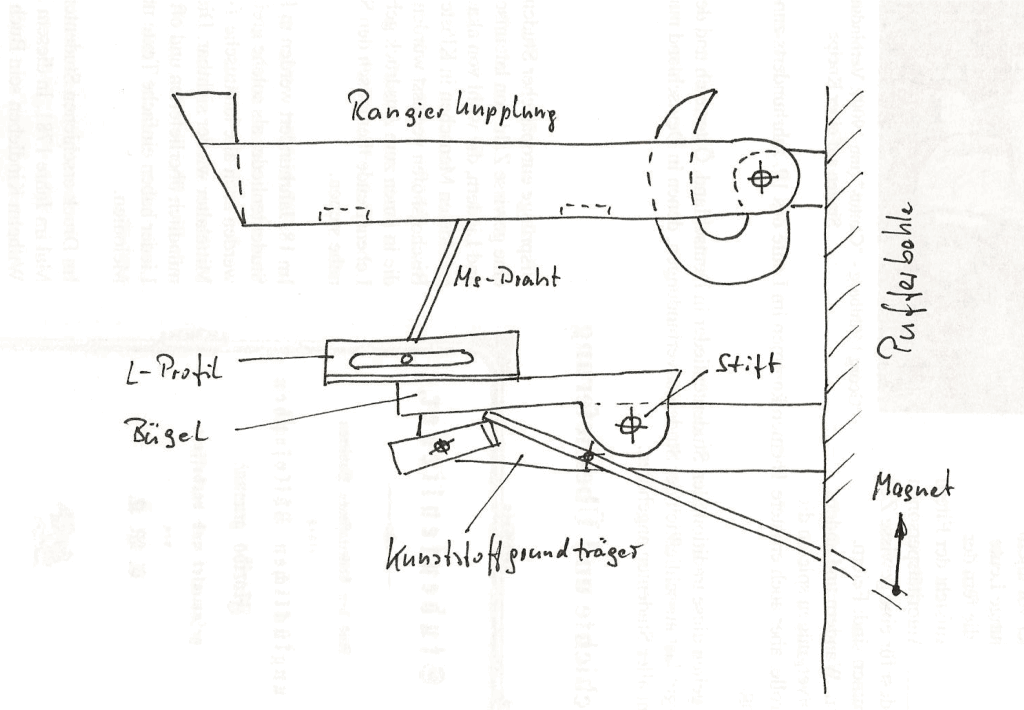Als erstes ziehen wir die Stifte, damit die Fallkupplung und der darunter liegende Bügel aus dem Kunststoffgrundträger entfernt werden kann. Der Kunststoffträger und der Bügel werden entsprechend der Zeichnung gekürzt. Aus einem L- Profil entsteht eine Führungsschiene mit einem Kulissenschlitz, die auf den Bügel gelötet wird. Aus Messingstreifen wird die neue Rangierkupplung gefertigt und am Zughaken mittels eines Stiftes locker befestigt. D.h., die Rangierkupplung muß durch ihr Eigengewicht nach unten fallen. In etwa der Mitte der Rangierkupplung wird ein 0,5mm Ms Draht gelötet, der nach ca. 5mm rechtwinklig in den Kulissenschlitz führt. In der Ruhestellung sollte die Kupplung etwa 5° geneigt sein. Durch die schräge Auflauflippe wird die Kupplung beim Kuppeln leicht angehoben und fällt durch das Eigengewicht in den Zughaken. Durch betätigen der F3 Taste am Fahrregler sollte sich die Rangierkupplung heben und die Zugtrennung eingeleitet. Durch Formen des Messingdrahtes kann die Höhe der Kupplung eingestellt werden. Wenn alles funktioniert, kann mit der farblichen Behandlung begonnen werden und der Spaß beginnen. Nein, ich meine nicht das Rangiergeschäft, sondern das erneute Justieren der Kupplung. Aber dann geht es los.