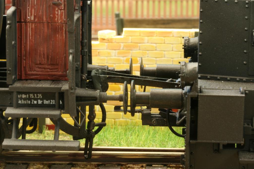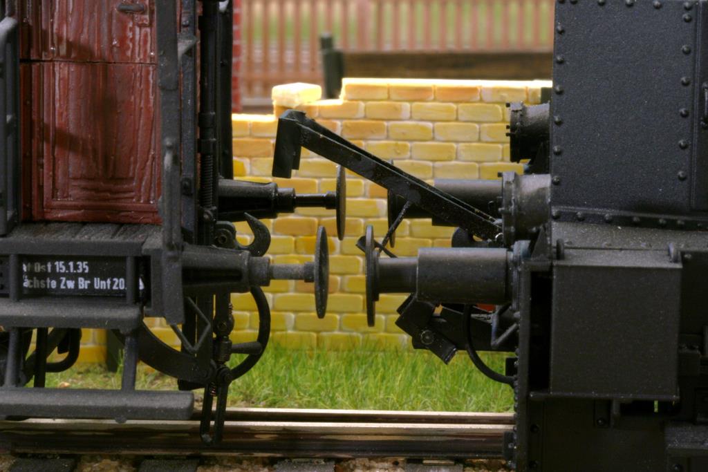 Ach so, noch ein paar Worte zu eventuell auftretenden Problemen. Die Kupplung funktioniert bei großen Radien, und weitgehend sauber verlegten Gleisen. Das Kuppeln in der Kurve ist nur bedingt möglich. Auch sind die Köpfe der Kupplungshaken der unterschiedlichen Hersteller ggf. zu erweitern. Die Höhe der Kupplungen sollte identisch sein, da sonst die Rangierkupplung nicht aus dem Haken kommt. Wer ausschließlich mit Lenz- Wagen fährt hat keine Probleme. Hier stimmt alles.