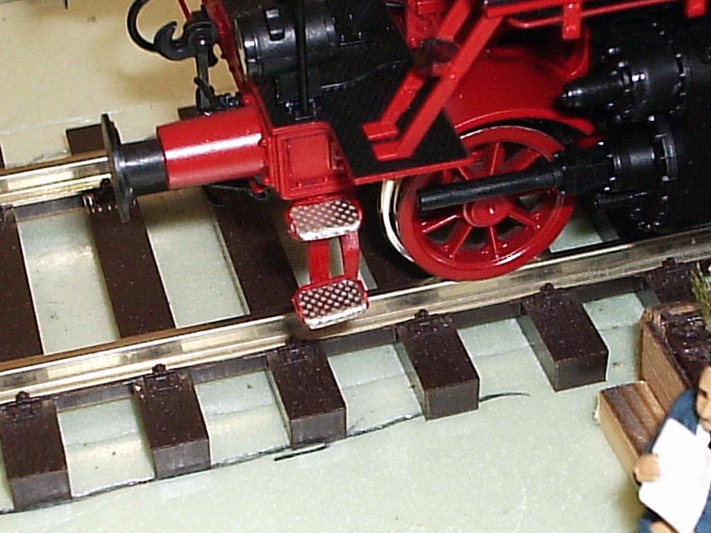 Bernd Lachmund hat das Überfahrblech passend ausgeschnitten und die BR 64 ein bisschen aufgebretzelt. Die Fotos zeigen die noch unlackierten Bleche, die mit Sekundenkleber befestigt wurden.
