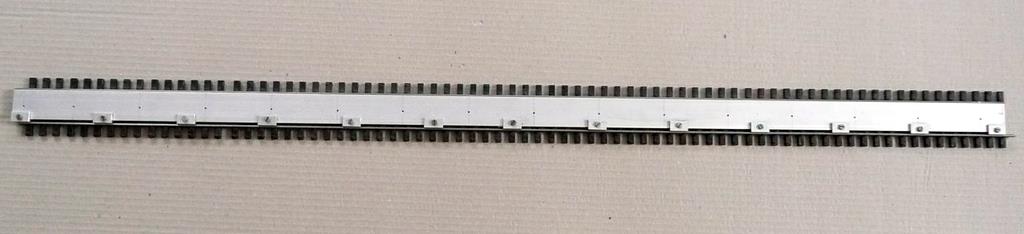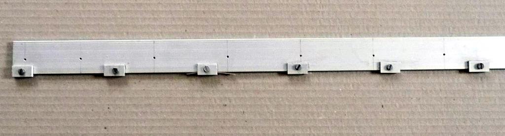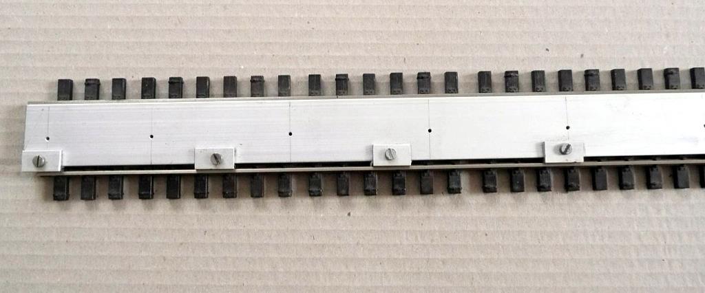 Da die aufgeklebten Winkel beim Einlegen in das Gleis auf Abheben und nicht auf Abscheren belastet werden, ist eine Sicherung der Verklebung mit Schrauben erforderlich, sonst springen die Dinger beim Handling nach und nach ab. Hier erfolgte die Sicherung mit Zylinderschrauben M3. Dazu wurde in die verklebten Teile ein gemeinsames Gewinde geschnitten.