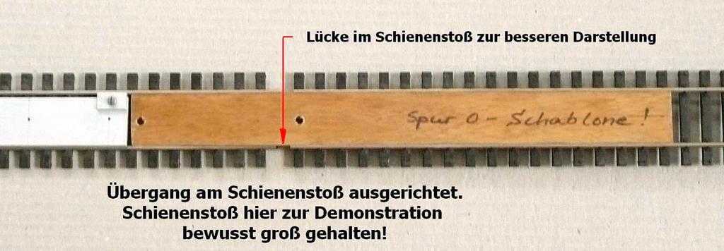 Die kurze Schablone aus imprägniertem Holz dient der Ausrichtung des Flexgleises an Schienenstößen (Schienenstoß hier bewusst weit auseinander gezogen damit man das besser erkennt). Dazu wird die lange 1 m-Schablone auf dem Foto nach links verschoben. Deren linker Überhang wird an dem dort vorhandenen Schienenstoß entsprechend genutzt.