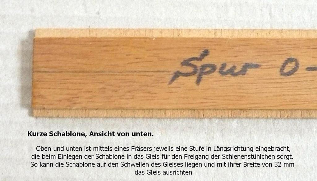 Die Holzschablone erhält gefräste Kanten, damit die Schienenstühle Platz haben. Die stehen gebliebene Breite zwischen den gefrästen Stufen beträgt 25 mm. Die stufen sind jeweils 2,5 mm tief. Das reicht für den Freigang der Schienenstühle bei Plastikschwellen (0-Scale-Version).