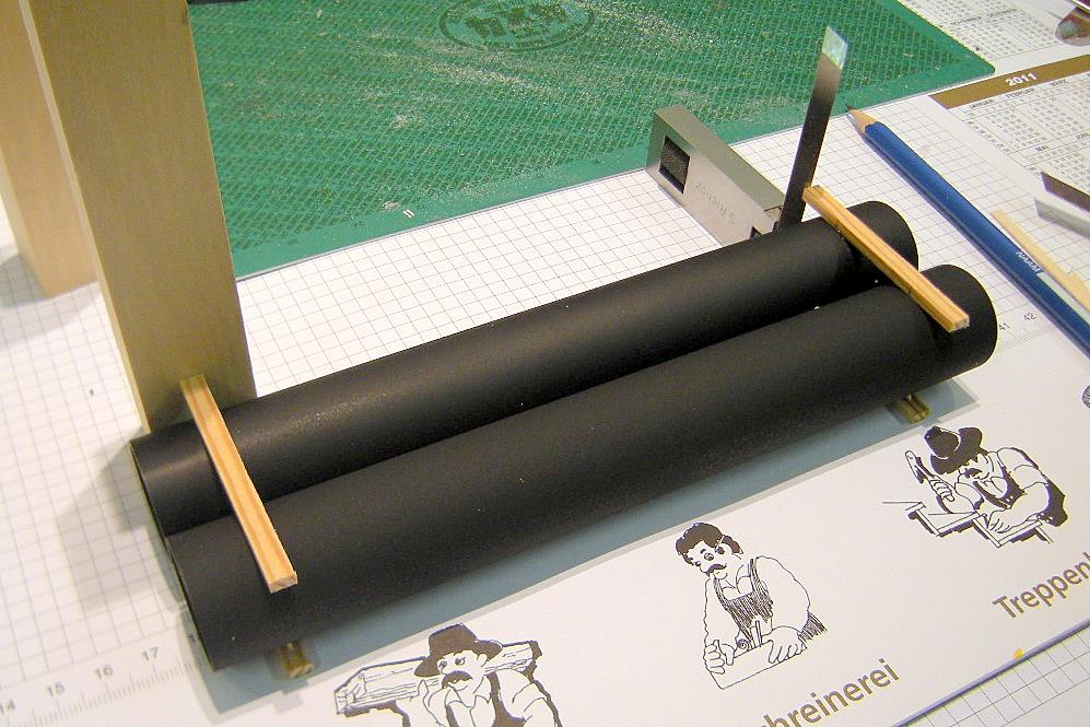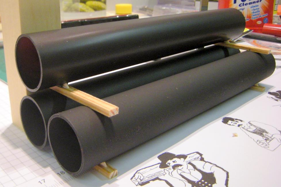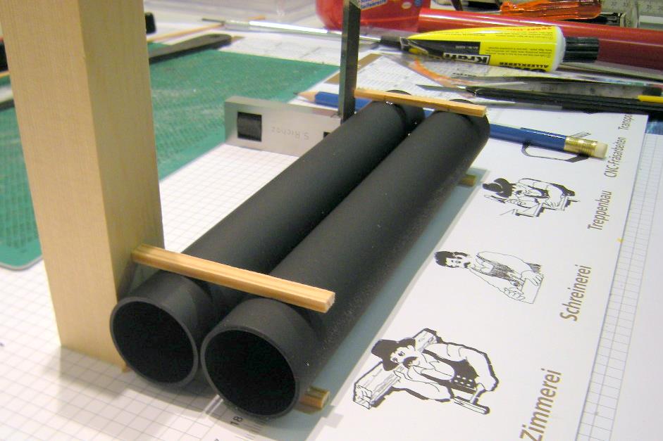 Gefällt mir gut. Ich habe auch gerade die Röhren für meinen Rungenwagenzug geschnitten. Dafür verwende ich runde Kabelkanäle aus grauem Kunststoff. Sie werden dann natürlich noch schwarz gespritzt. Sie waren recht günstig – aber deine Rohre sehen super aus und sind preislich wohl unschlagbar . . .