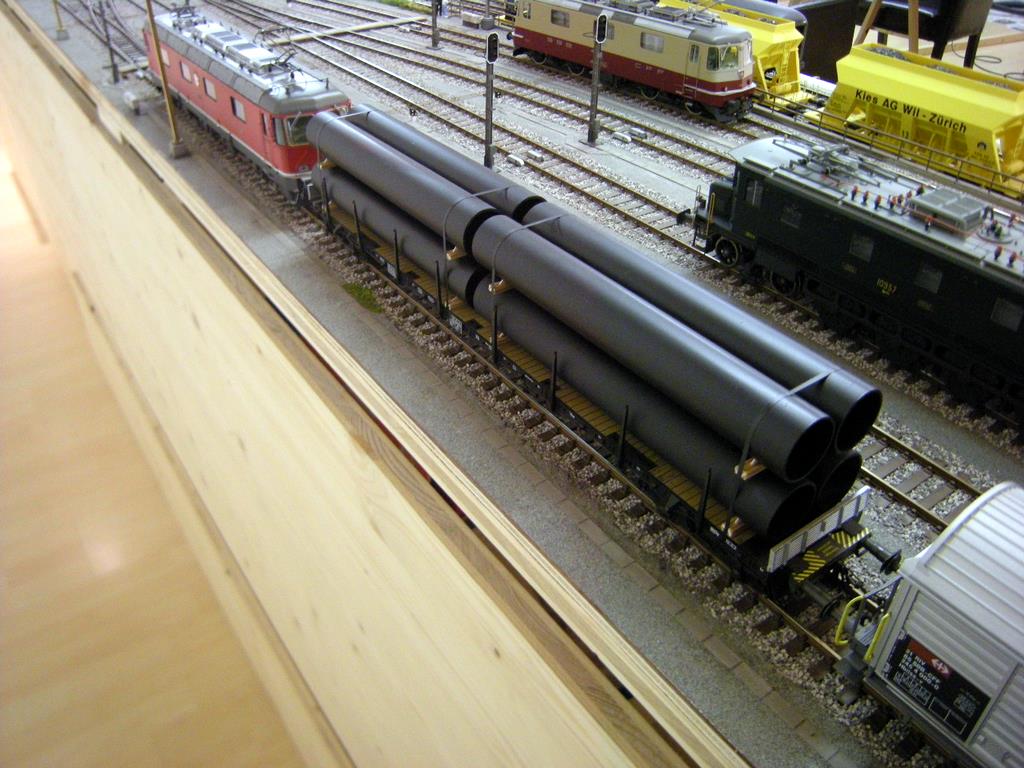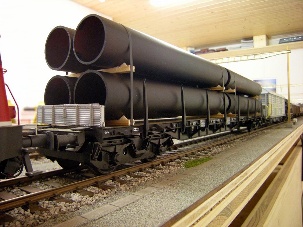 Nachdem mein Kollege Sigi für diverse Rivarossi-Rungenwagen ja schon Betonelemente als Transportgut gefertigt hatte, hat es ihm diesmal eine Röhrenladung angetan. Mit solchen Basteleien füllt er jeweils die Zeiten aus, an denen die Lust auf den Weiterbau an seiner Anlage fehlt. Und so ist kürzlich seine Mitteilung in folgendem Sinne bei mir eingetroffen: