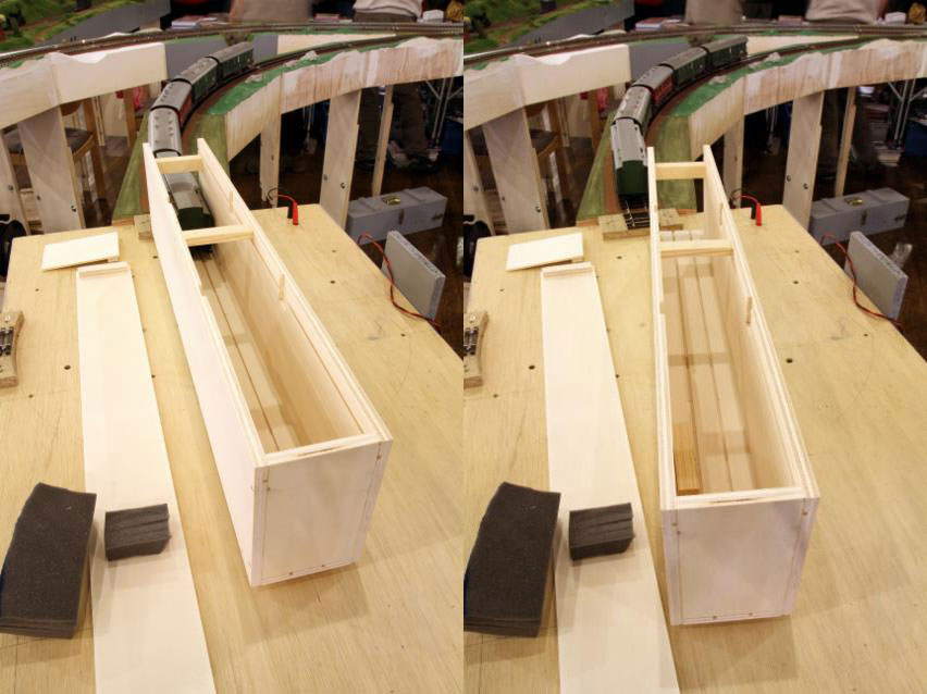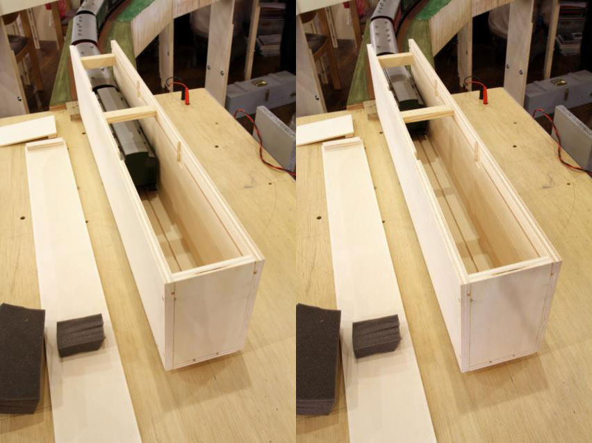Die fertig geparkten Wagen werden mit weichem Schaumstoff beidseitig und von oben fixiert. So sind sie gegen seitliches Umkippen geschützt und werden sanft auf die „Schienen“ gedrückt. Es gibt zwei Deckel, von oben, und von der Einfahrseite aus. Beide werden über Nuten in den Seitenwänden geführt. So braucht man nicht einmal Verschlüsse und Beschläge.