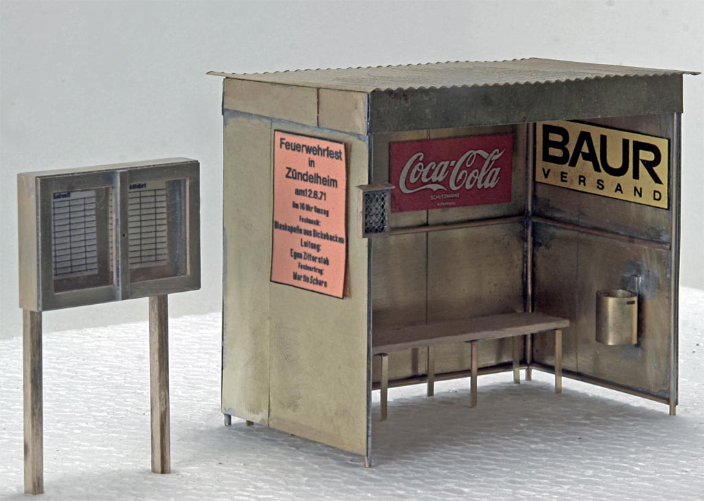 Die 0,15mm starken Ms-Bleche, die 1mm Drähte und das Wellblechdach sind einbaufertig gefräst (Bleche) und zugesägt (Drähte, Wellblechdach), so dass einem zügigen Zusammenbau nichts im Wege steht. Wie man sieht, ist das Modell von so zeitloser Hässlichkeit, dass es schon wieder schön ist. Die Rückseite des Schaukastens ist abnehmbar. Fahrplanfreaks können so problemlos zwischen Sommer- und Winterfahrplan wechseln.