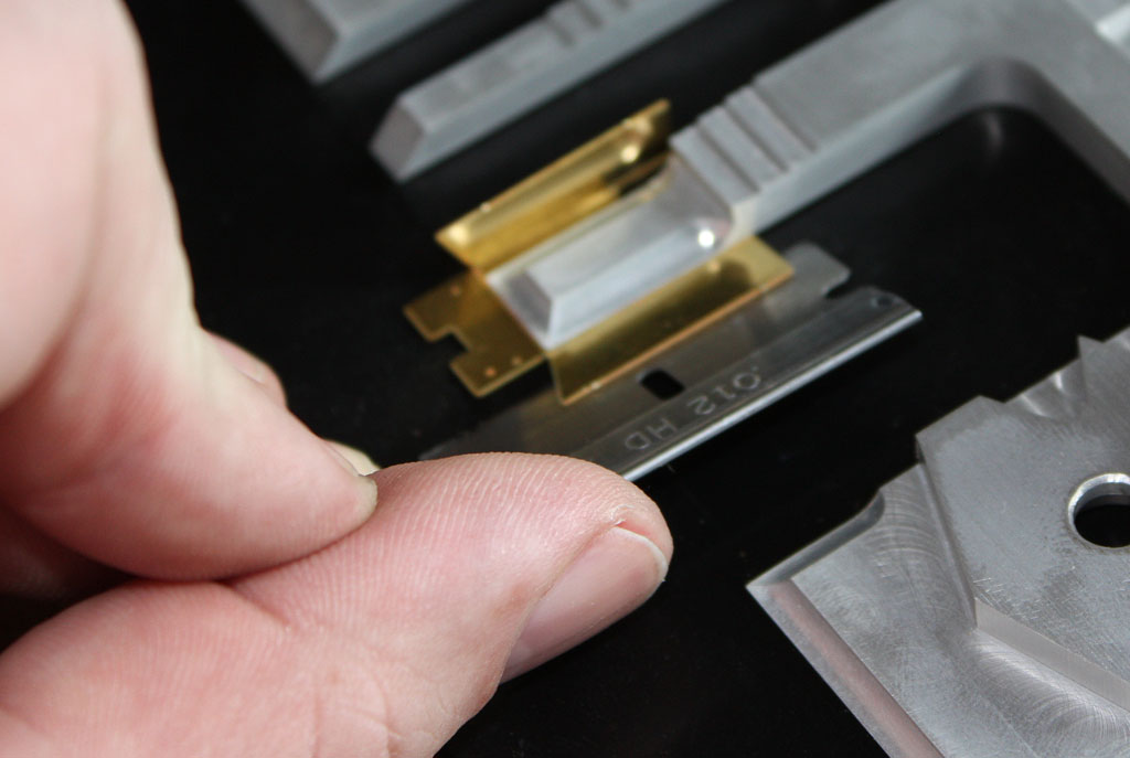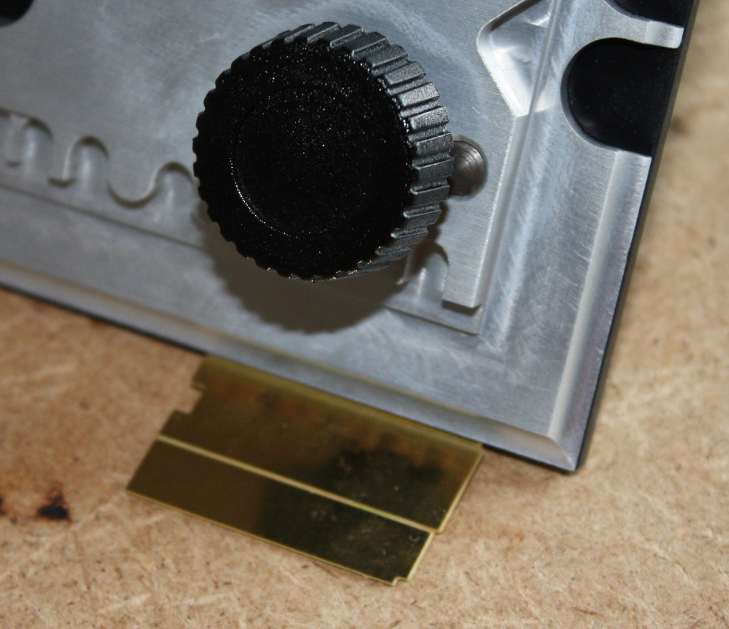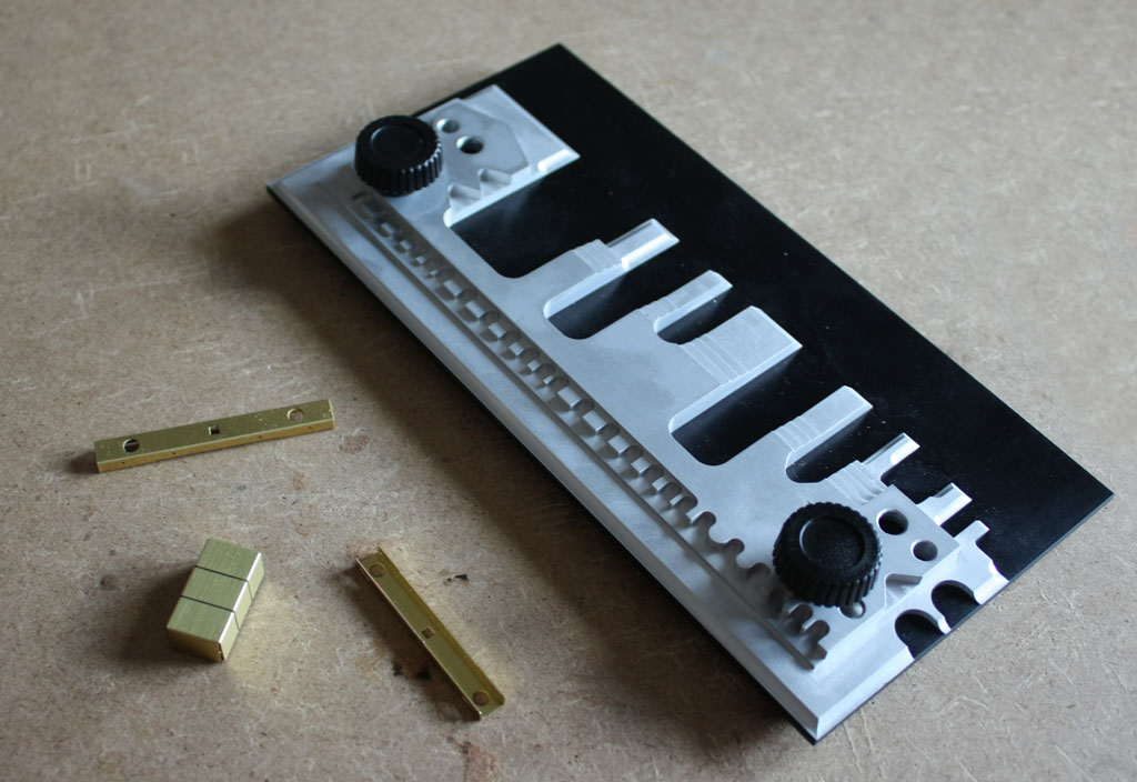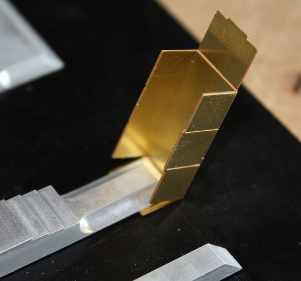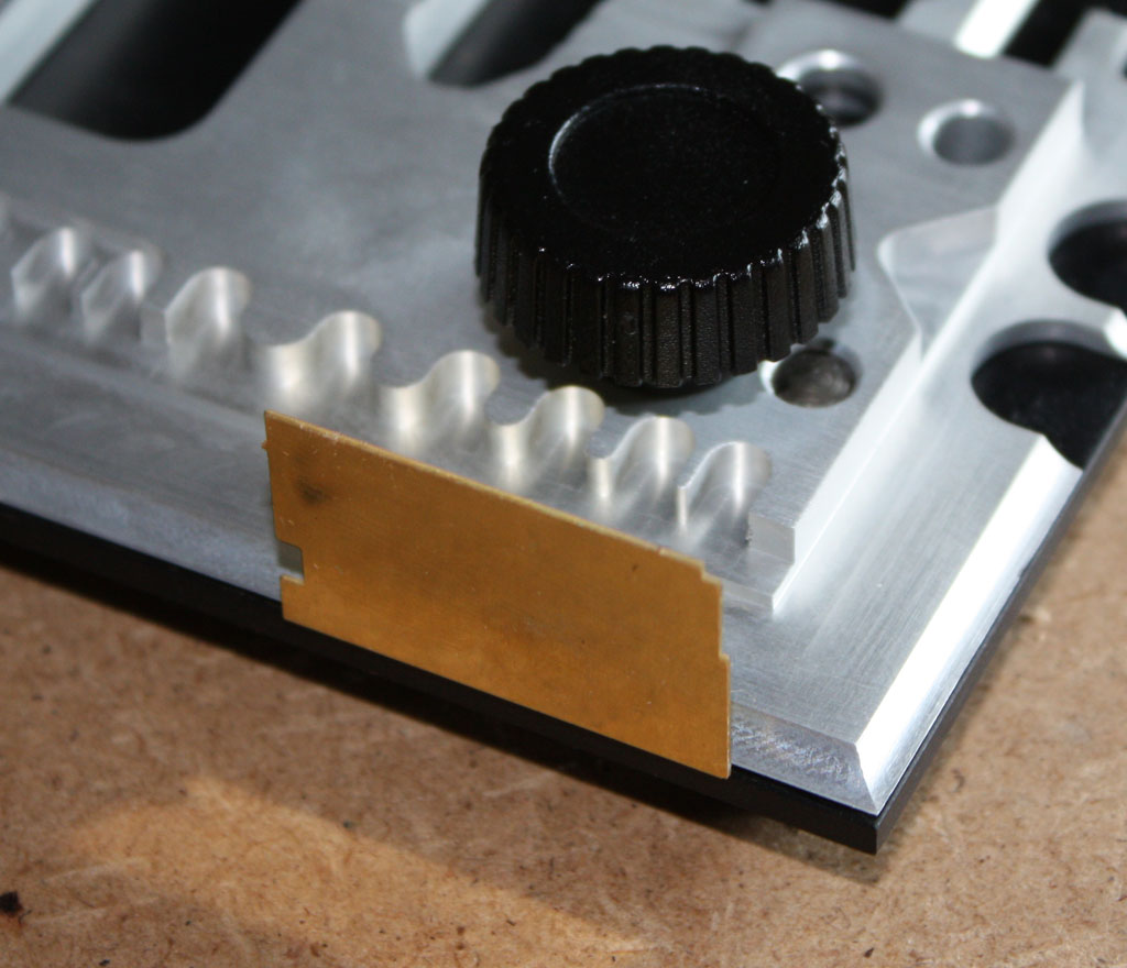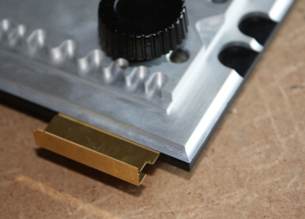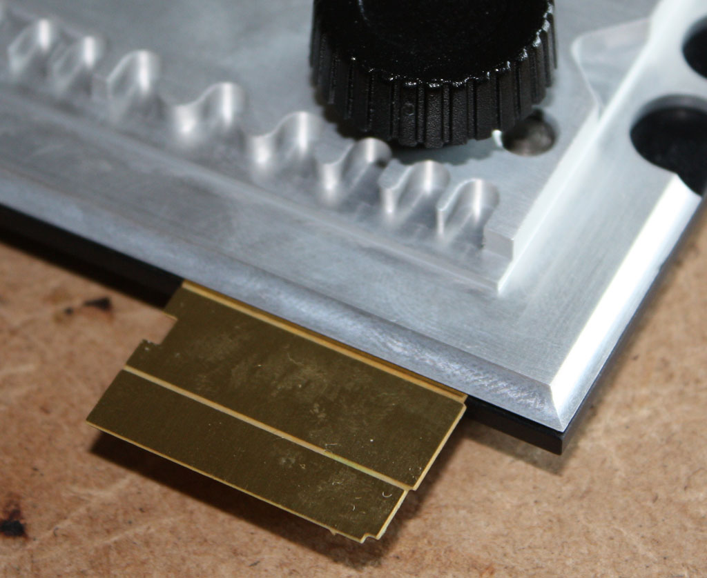 „The Bug“ ist ein solides Werkzeug mit einer Arbeitsgröße von 101 x 203 mm. Auf einer massiven Bodenplatte ist eine stabile Klemmplatte aus Aluminium mittels zweier gefederter Bolzen angebracht. Die Klemmplatte wird mit zwei Arretierknöpfen auf die Bodenplatte gedrückt. Das Biegen ist also nicht schwer. Die folgende Bildfolge zeigt, wie einfach mit „The Bug“ Messing gebogen wird: