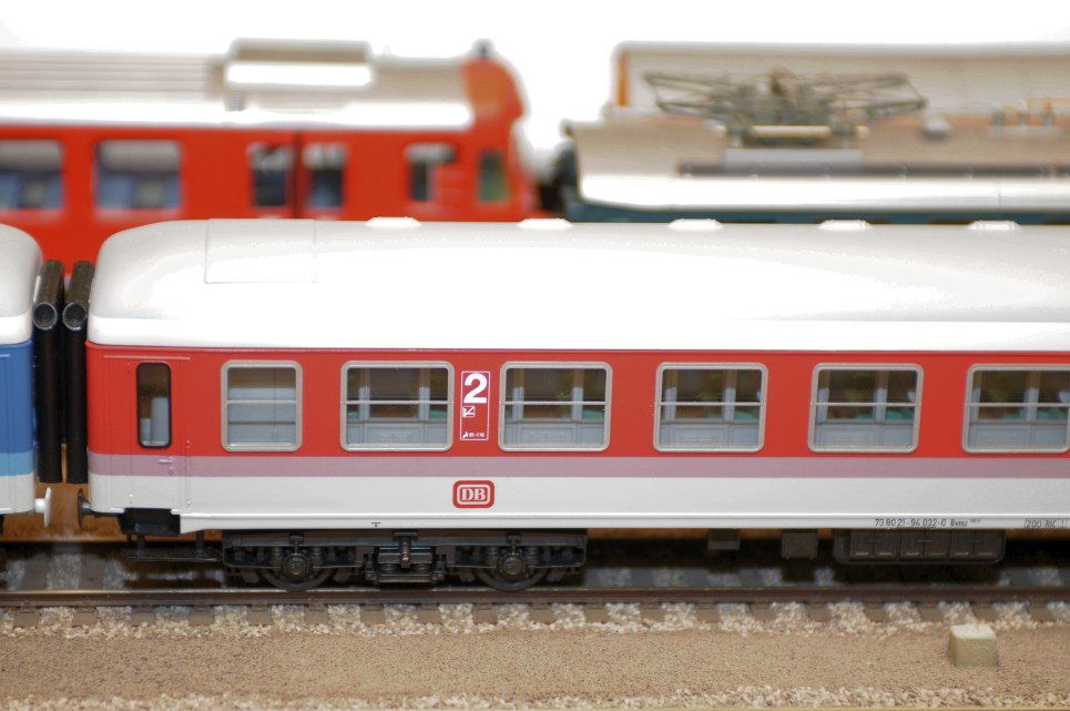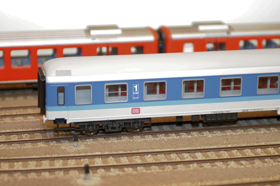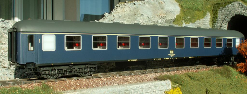 Vor vielen Jahren hatte ich in einer Modellbahnzeitschrift mal ein Photo eines Handmusters von einem deutschen Hersteller (Kiss?) gesehen, bei dem ein Rivarossi D-Zugwagen in einen blau/weissen Interregio Wagen umgespritzt worden war. Nach einer späteren Fahrt in diesem Zug von Konstanz durch den Schwarzwald, inklusive Besuch im Bistrowagen, war für mich klar, dass ich mir unbedingt so einen schönen Zug bauen wollte. Die Farbgebung und das Ambiente dieser Wagen hatten es mir einfach angetan und es ist für mich nach wie vor das schönste und gemütlichste Design, das ich kenne. Ist auch kein Wunder, da ja diese Wagen dem Konzept einer „Organischen Gestaltung“ entsprungen sind, die ein menschenwürdiges Umfeld zum Ziel hat. (Weitere Beispiele für organisches Gestalten kann man unter www.organische-architektur.org nachlesen.)