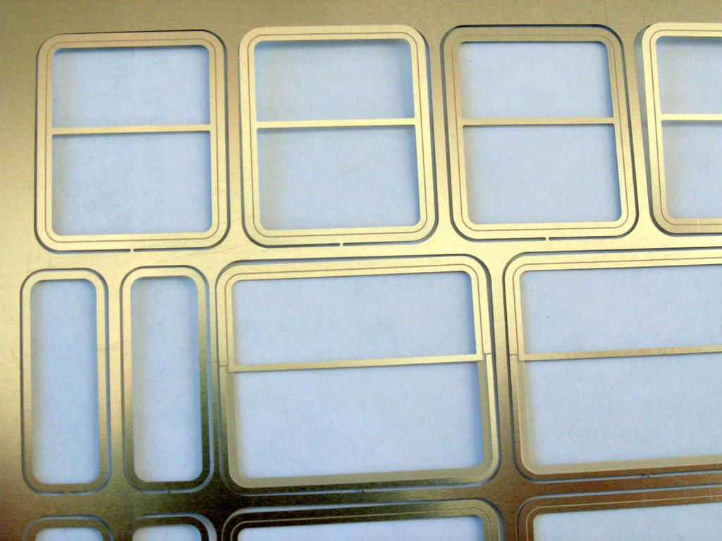 Nach dem Ausmessen am Vorbild im Bahnhof Lindau – mit Unterstützung eines sehr zuvorkommenden Schaffners eines ALEX – nahm ich dann Kontakt mit meiner Ätzfirma auf, um die Situation zu erörtern. Dort hatte ich ja bereits die Rahmen für den TEE-Wagen ätzen lassen. Nach einer Mail mit Zeichnungen und Photos und 2 klärenden Telefongesprächen schien die Situation für den Ätzer offenbar schon klar. Seine guten Ideen sollten so umgesetzt werden, dass sehr dünne Fensterrahmen entstehen sollten, die aber trotzdem noch eine Tiefenwirkung haben. Ich war natürlich etwas skeptisch, aber der Ätzer bot mir an, mal eine Probeätzung zu machen, die man nachher noch anpassen könne. Zu meiner riesengroßen Überraschung bekam ich innerhalb kurzer Zeit ein Produkt, das mehr bot, als ich eigentlich unter den gegebenen Bedingungen erwarten konnte, denn schließlich sind ja die vorhanden angespritzen Fensterrahmen immer noch am Wagenkasten.