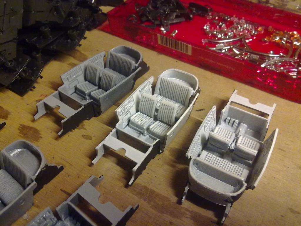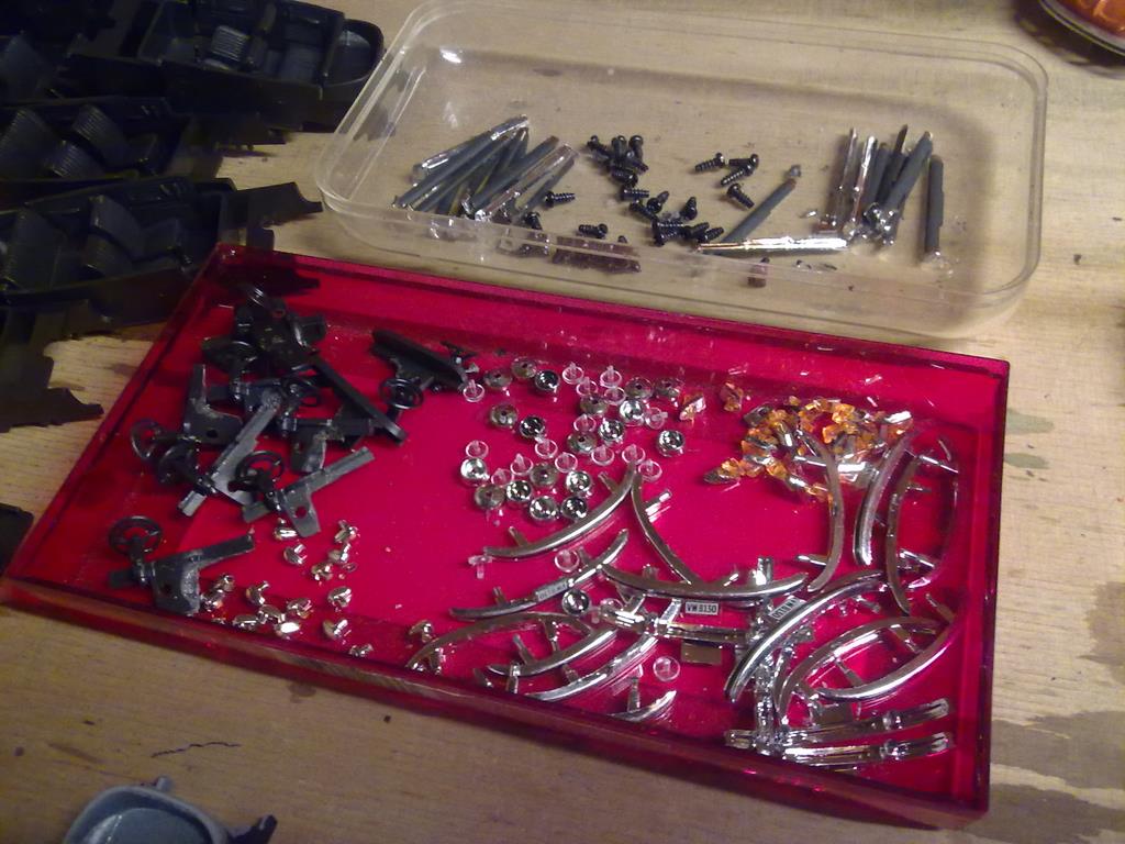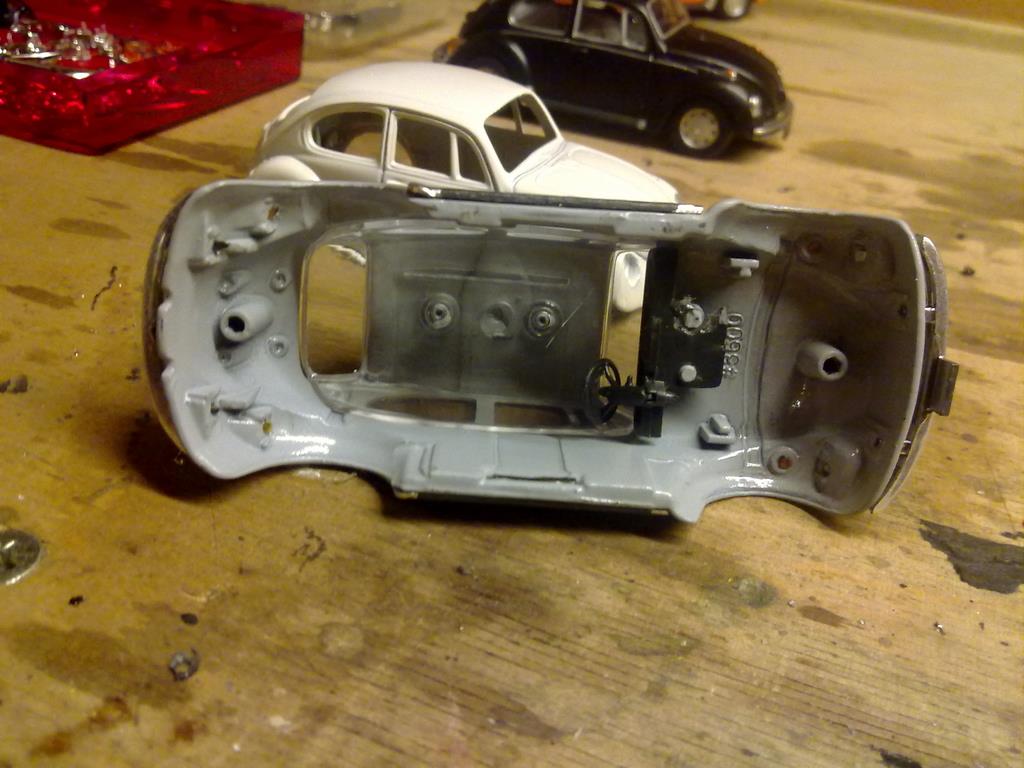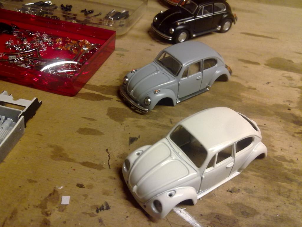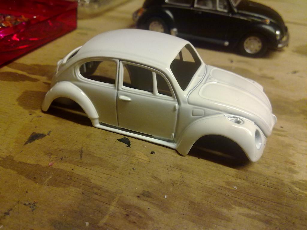 Die Käfer können in ihre Einzelteile zerlegt werden dabei sollten gleich die Gussreste mit entfernt werden. Die Karosserie ist in den damals üblichen Farben zu lackieren, dann sind die Anbauteile (Stoßstangen, Blinker, Scheinwerfer ohne Gläser und schwarz lackierte Seitenschweller) wieder festzukleben. Danach ist mit einem Mattlack dem Auto der unnatürliche Glanz zu nehmen. Ich bin nicht sicher, ob damals schon die Autos zum Transportschutz eingewachst waren. Danach sind die Scheinwerfergläser und die Fensterverglasung wieder einzusetzen, bevor das Armaturenbrett eingebaut wird. Ich habe das zu früh eingebaut und die Fensterverglasung nur unter Schwierigkeiten und nicht immer ohne Beschädigung einsetzen können. Die Inneneinrichtung sollte auch farblich behandelt und dann wieder eingebaut werden. Schlussendlich werden mit dem Unterboden auch die Räder wieder befestigt. Ich habe fertig.