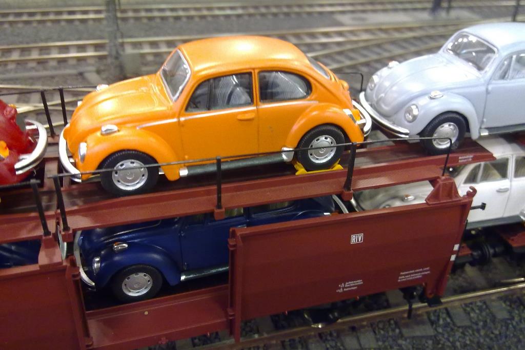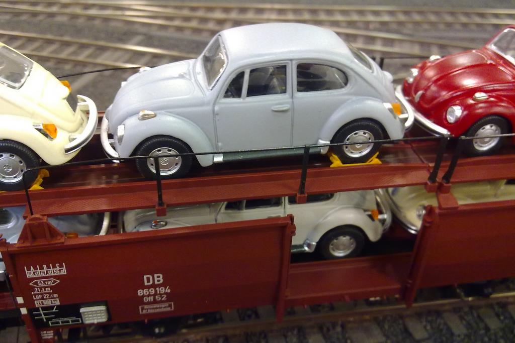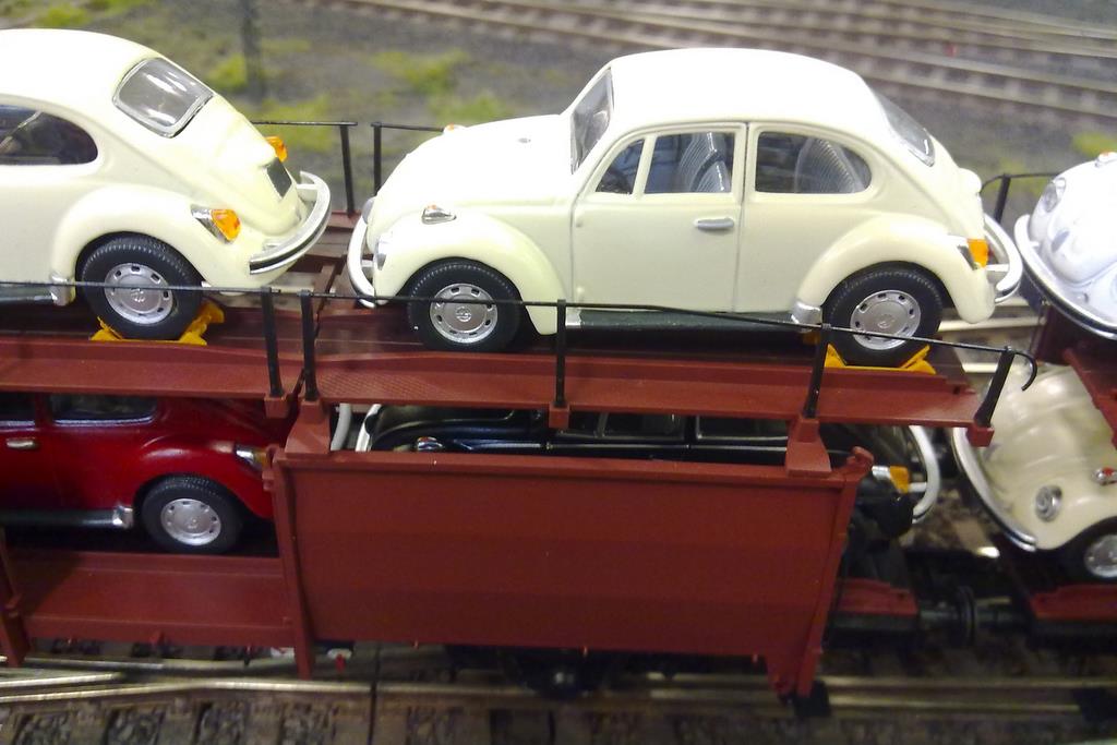 Als die Auslieferung der Brawa Off 52 abzusehen war, stellte sich mir die Frage nach der angemessenen Beladung. Von Wolfsburg über Braunschweig / Salzgitter kamen in den 60ern die Züge mit neuen Autos aus dem VW-Werk in Kreiensen auf der Ostseite an, um dort umgespannt zu werden und Richtung Süden weiterzufahren. Fotos belegen Ganzzüge und Frachtenzüge mit Wagengruppen, die mit VW Käfern oder VW 1500ern beladen waren.