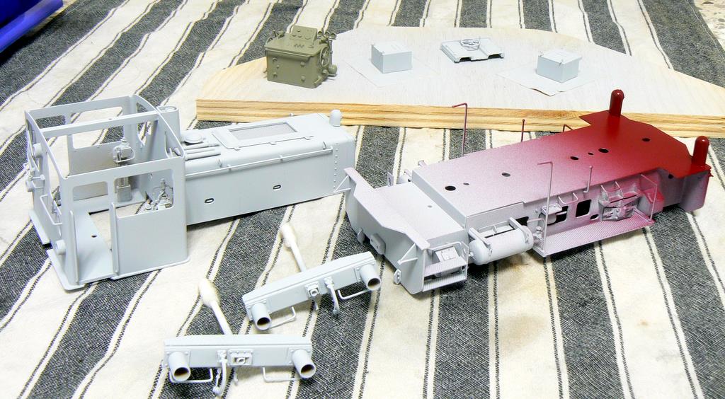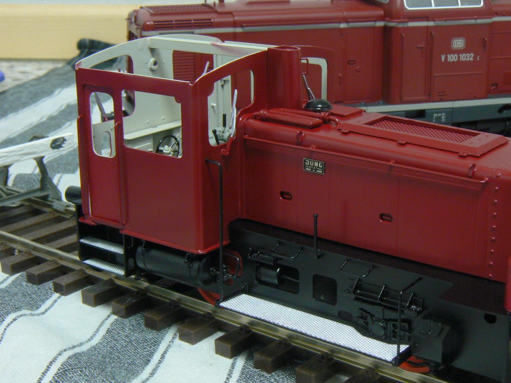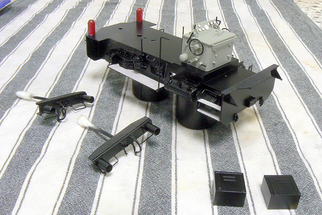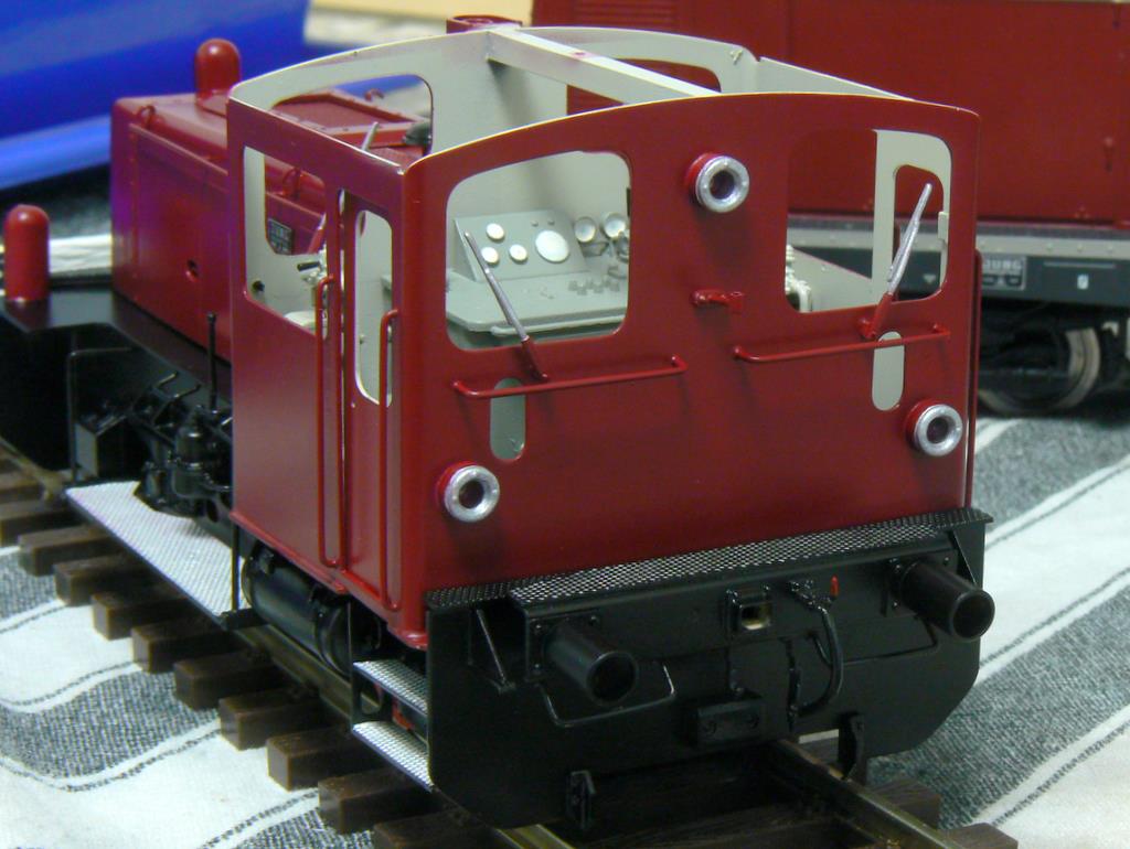 Die vorderen Lampen sind schon rot (RAL 3004) lackiert. Die Lampen werden abgeklebt und dann der Rahmen schwarz (RAL 9005) lackiert. Das Führerpult ist grau (RAL 7023) lackiert. Mit dem Rahmen wird auch der Führerhausboden schwarz lackiert (Von unten und von oben!). Wenn das Ganze trocken ist, lege ich im Führerhaus eine Schablone ein, die ich aus 0,4 mm Polystyrol angefertigt habe; damit bekomme ich eine saubere Farbkante hin. Dann ist die Innenseite des Führerhauses an der Reihe. Zusammen mit dem Werkzeugkasten wird hier ein helleres Grau gespritzt (RAL 7032).