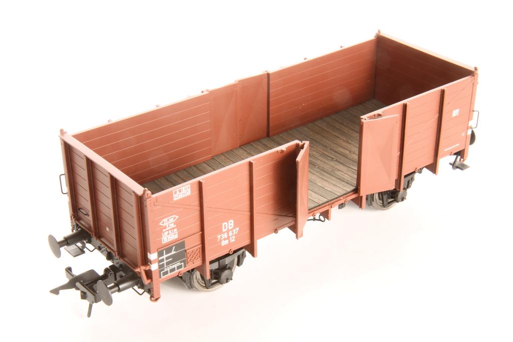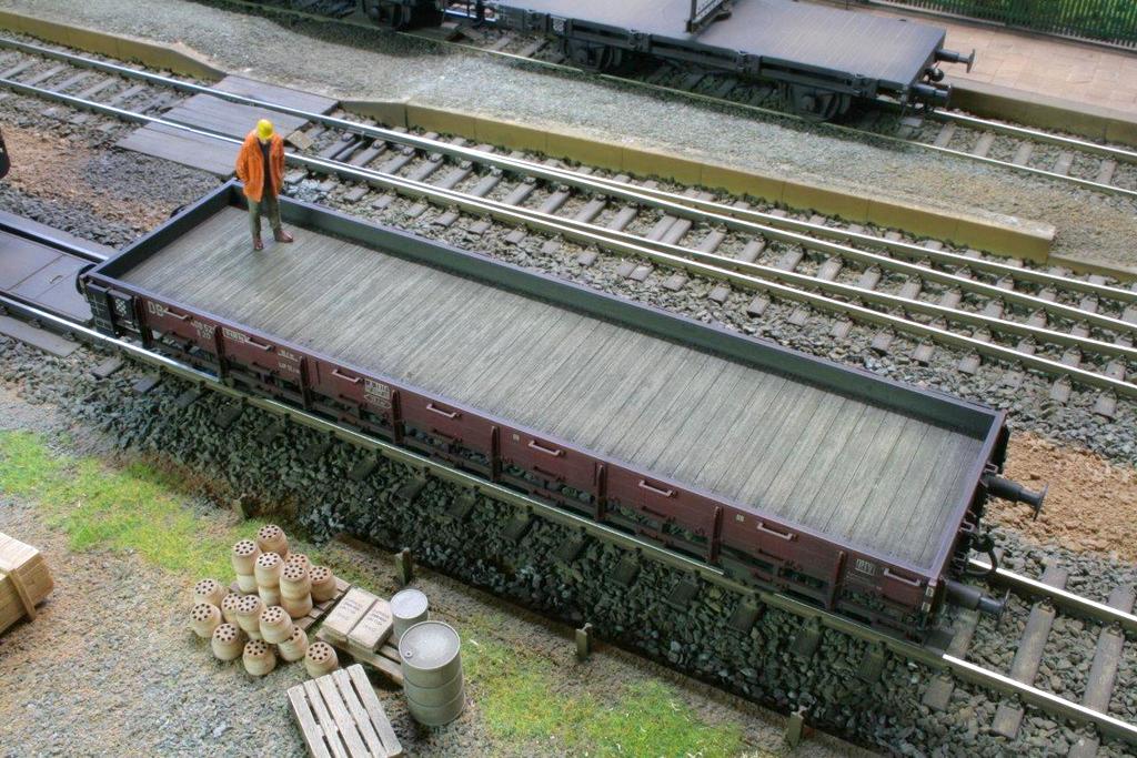 Die Einlegeböden sind aus hauchdünnem Karton (0,35-0,38 mm) und präzise ausgeschnitten. Nicht nur die Holzbohlen werden mit feiner Maserung nachgebildet, sondern auch alle Beschläge und die Vernagelung. Die neueste Version passt in den offenen Güterwagen Om12 von Lenz.