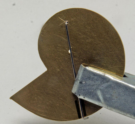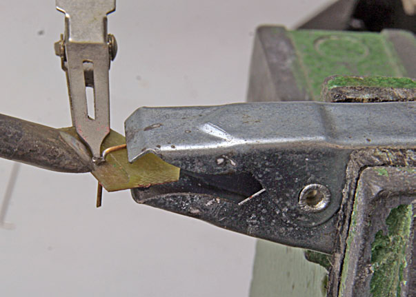 Ein Ende der neuen Griffstange wird in die Lötlehre gesteckt, mit einer kleinen Leimzwinge fixiert und verzinnt. Wieder reichlich Lötwasser auf die Lehre geben, Haltelasche aus der Fräsplatine brechen und mit einer Haarklammer positionieren. Haltelasche mit dem Kolben erwärmen. Mit dem anderen Ende ebenso verfahren. Die Griffstangen werden mit einem Glasradierer versäubert und können mit Acryllack von Weinert (RAL 9006, Nr. 2647) lackiert werden.