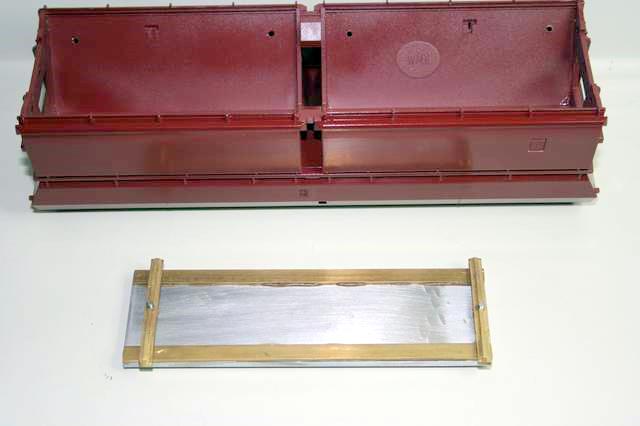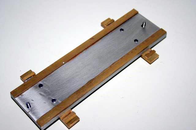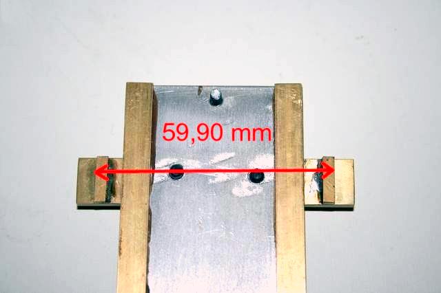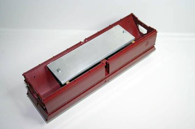 Die Einbaulehre besteht aus einer Aluplatte mit zwei Messingprofilen am Rand sowie zwei 3,5 mm Bohrungen im Achsabstand. Zum Einbau werden die beiden Streben, die die Drehgestelle aufnehmen, in den Wagen gelegt, die Platte aufgesetzt und dann mit den Schrauben erstmal festgezogen.