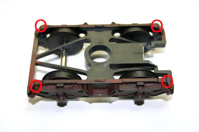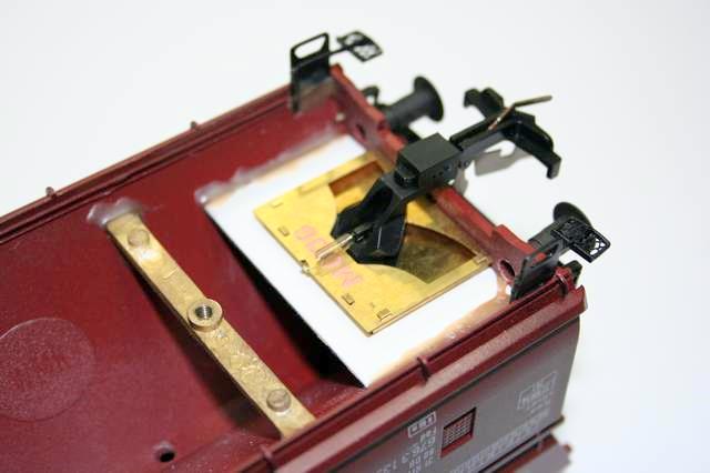 Die beiden Drehgestelle werden unten an der Schütte mit metallenen Drehgestell-Streben befestigt. Dazu sind kleine Nuten in den Schütten vorgesehen. Die exakte Position der Streben ist wichtig, deswegen soll eine Lehre den Einbau erleichtern.