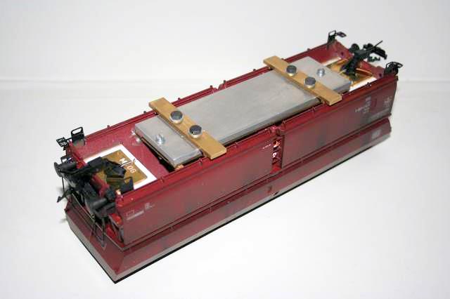 Damit ich die Wagen auch auf dem Lenz R1 Radius laufen lassen kann, wurden die Drehgestelle an den oberen Kanten abgefeilt/abgeschnitten. Das sieht man hinterher nicht mehr, denn die Oberkanten der Drehgestelle verschwinden unter der Schütte.