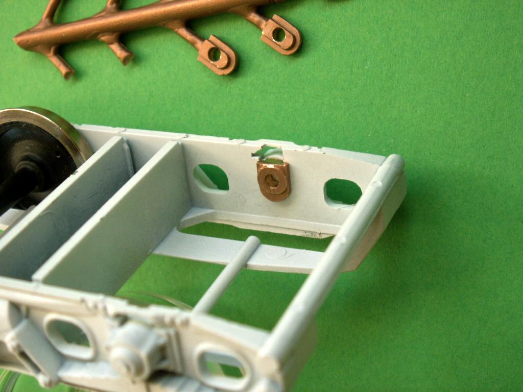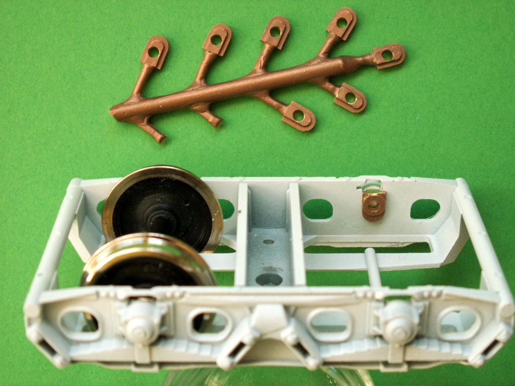 Ansonsten genügt es, die Radlager über die Achsen zu schieben, die Radsätze in die Drehgestelle zu setzen und Seite um Seite die Lager mit etwas nicht zu dünnem Sekundenkleber zu befestigen. Dazu sollen die Drehgestelle auf die Seite gelegt und das jeweils untere Lager eingeklebt werden. Nach dem Antrocknen kann das gleiche beim gegenseitigen Lager erfolgen. Ist der Kleber zu dünnflüssig (z.B. wie Wasser), könnte er im ungünstigsten Fall ins Lager gelangen.
